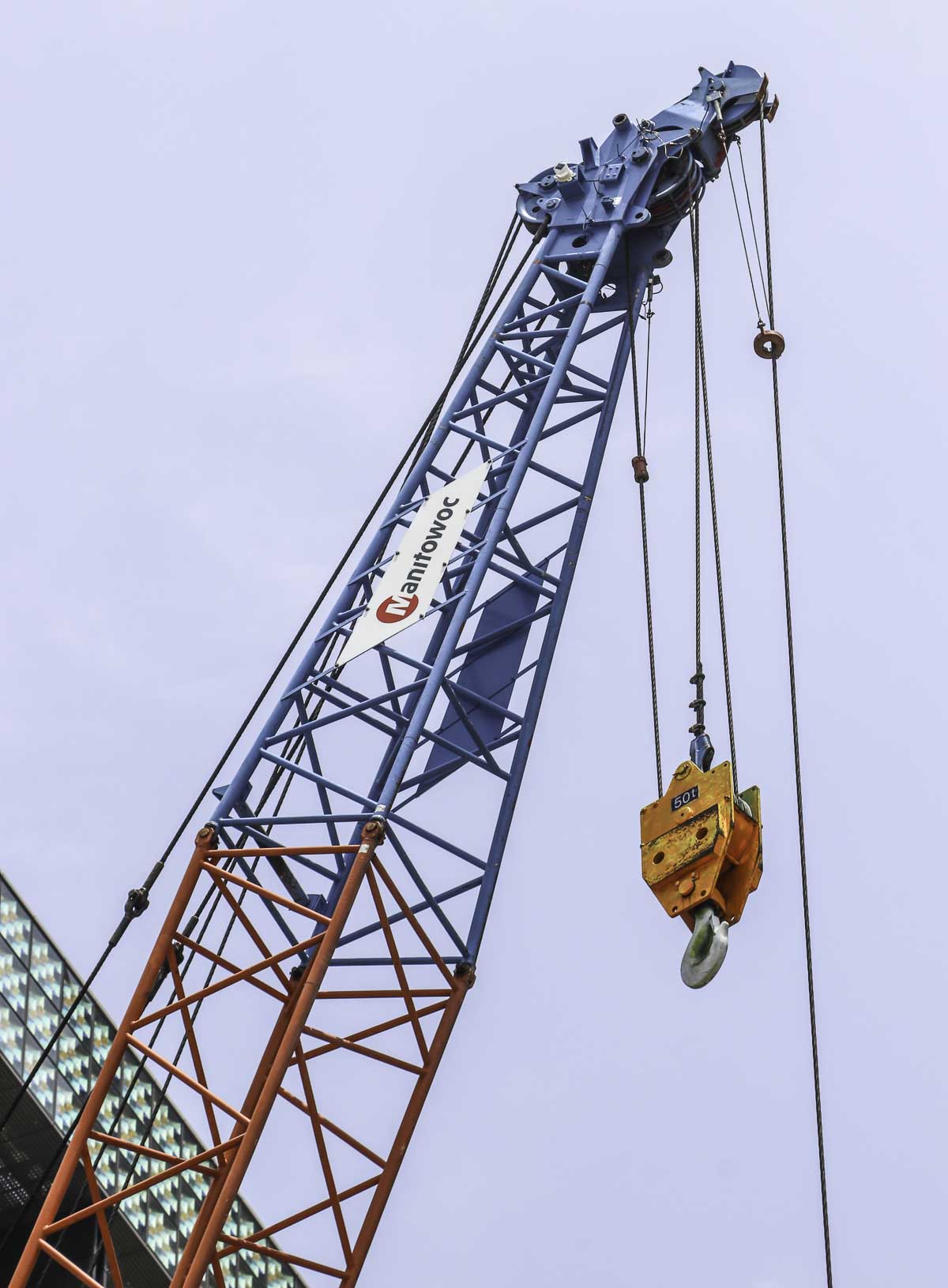 The crane is equipped with two 11-ton hoisting winches with 26 mm hoist wire. Both hoists were in use here.