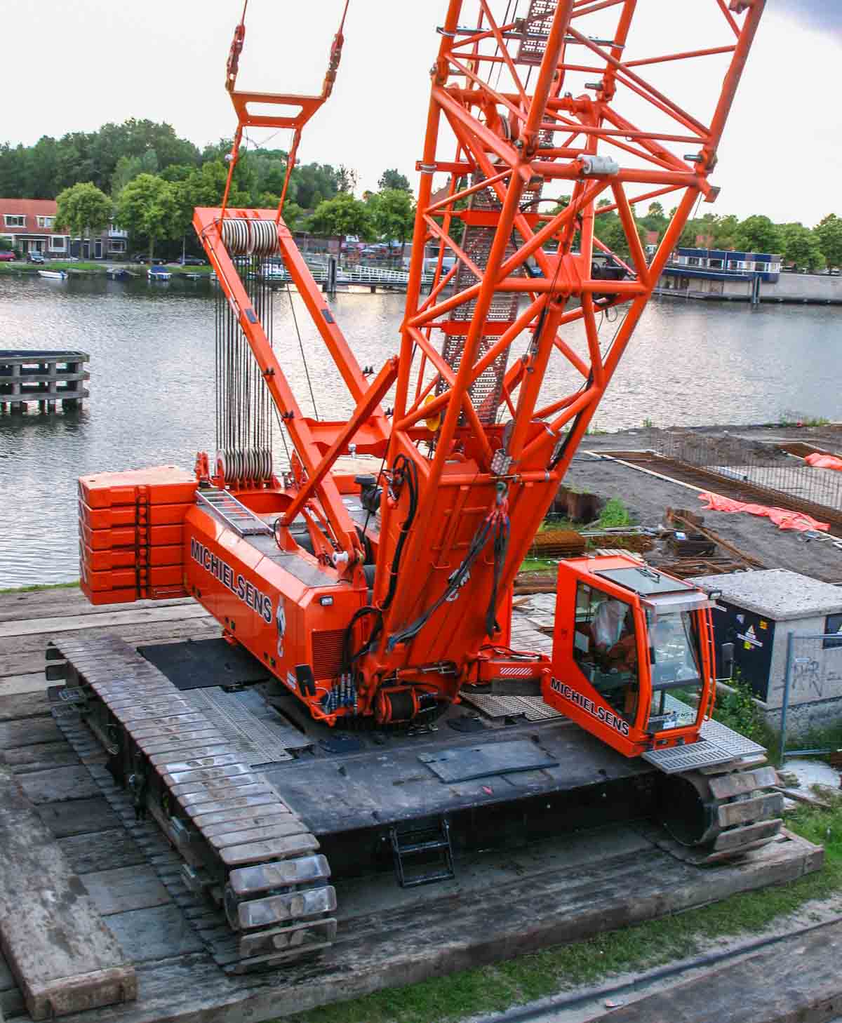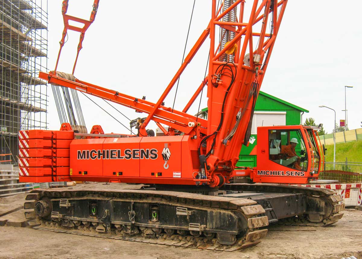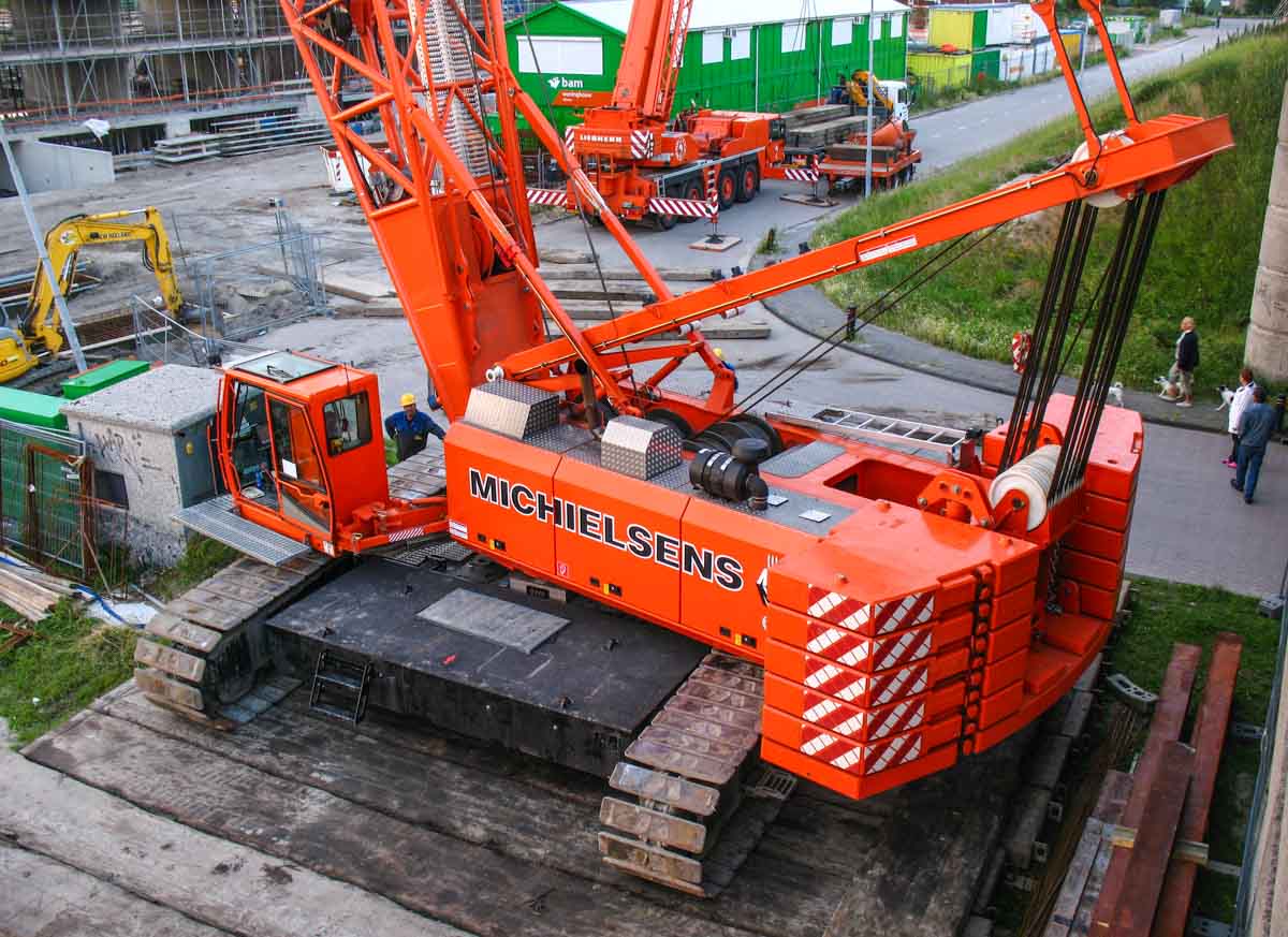 Here, the crane was configured in SHWS configuration. The main boom has a length of 52.3 metres and the luffing jib is 24.3 metres long in this setup. In this configuration, the crane can lift a maximum of 24.9 tonnes at a radius of 14 metres or 17.3 tonnes up to a radius of 30 metres. A fine crane from Michielsens, a company that no longer exists today.