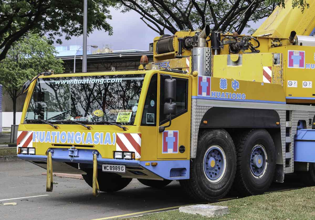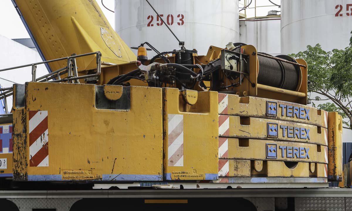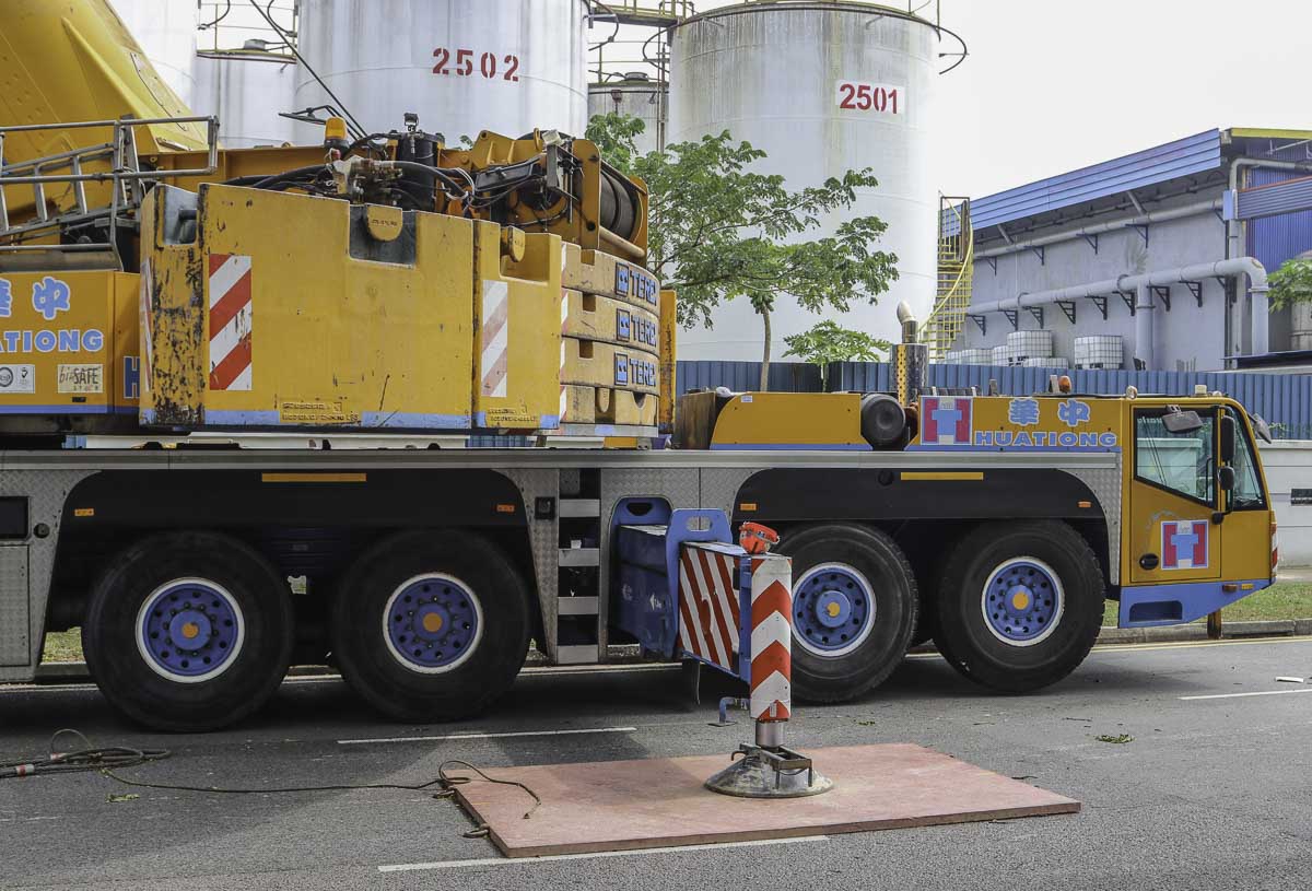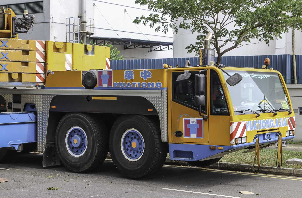 This impressive Terex AC 250-1 belongs to Huationg (Asia) from Singapore (SG) and was deployed during a weekend for lifting work at a factory. It is a 250-tonne telescopic crane mounted on a 6-axle carrier.
