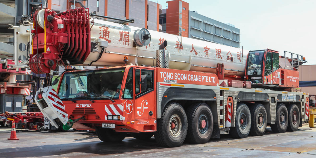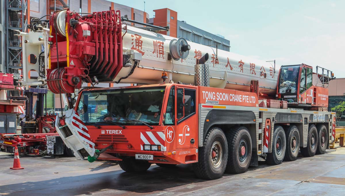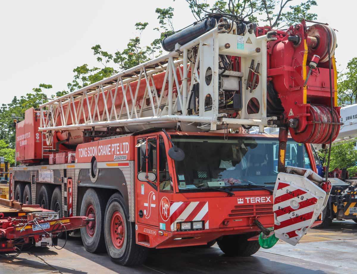 This fine Terex AC 250-1 belongs to Hup Hin from Singapore (SG). The crane, just like the Terex AC 160-2, carries the names and colours of Tong Soon Crane, also from Singapore, which company was taken over by Hup Hin. It is a 250-ton crane mounted on a 6-axle carrier.