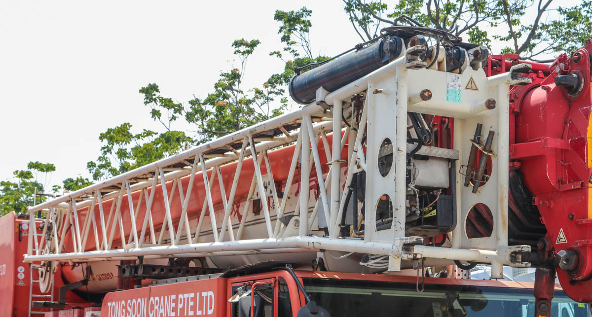 The crane is equipped with a seven-section main boom; the base length is 14.5 metres, and the maximum length is 80 metres.