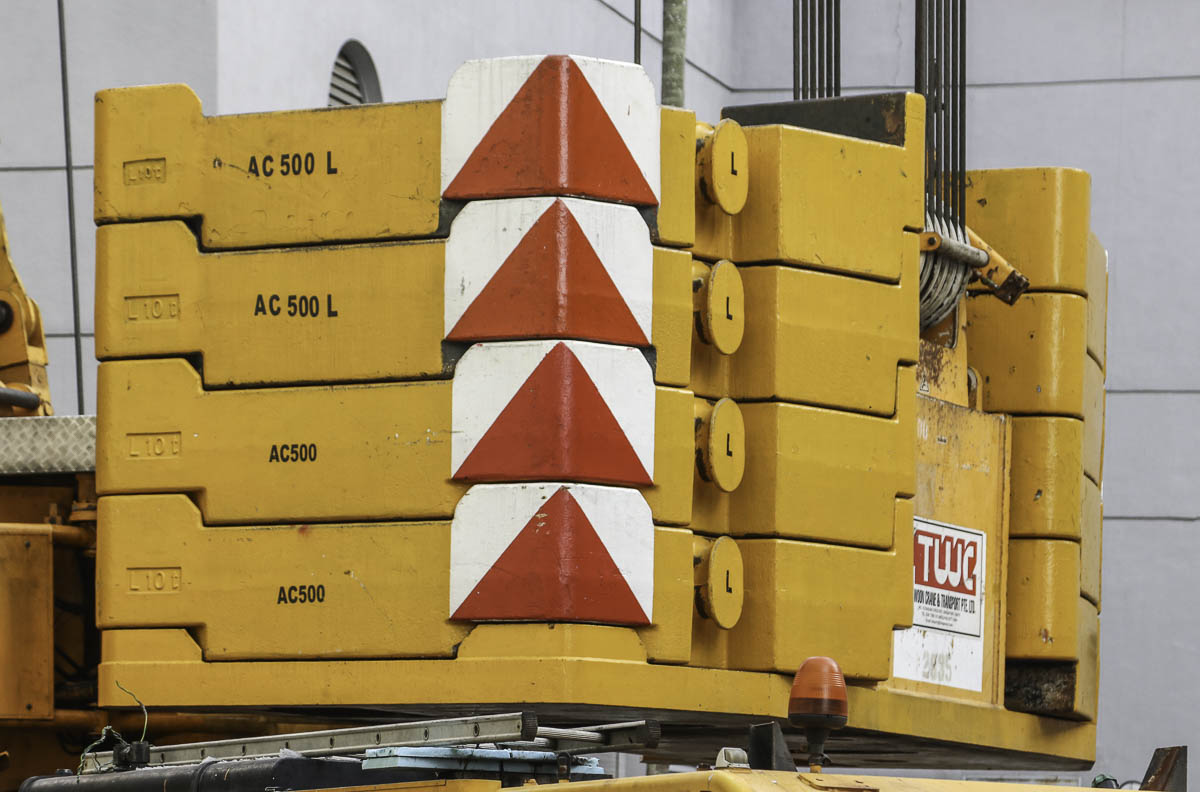 Here, the crane was assembled with 100 tons of ballast. The full ballast weighs 180 tons. The turning circle of the ballast is 6.1 meters.