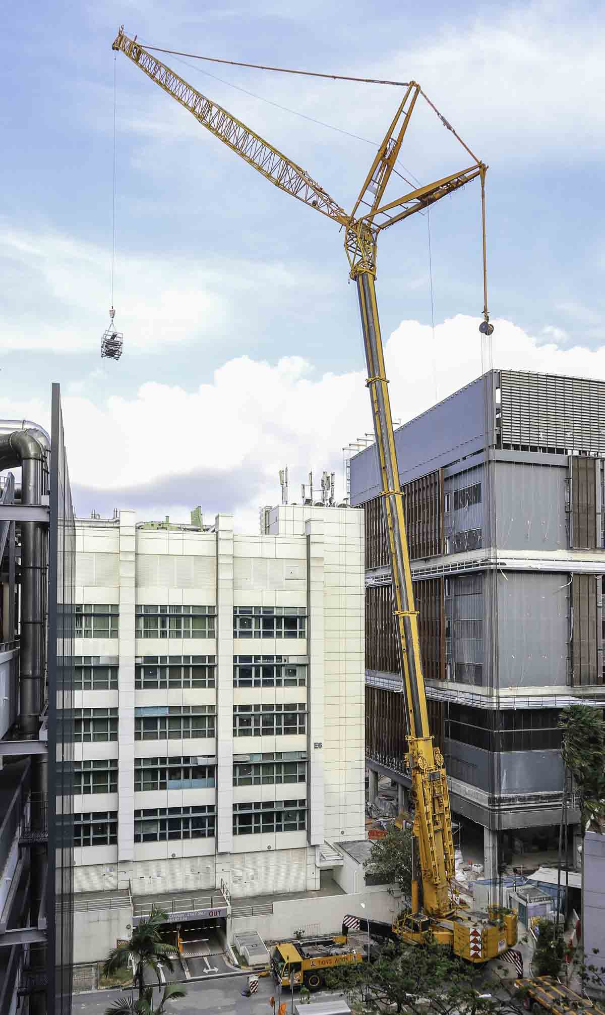 This very nice Terex AC 500-2 of Tiong Woon from Singapore (SG) was used on a Sunday to lift building materials onto the roof of a building. It is a 500-ton crane with an 8-axle undercarriage. Both Liebherr LTM 1500-8.1 belonging to Moh Seng were previously deployed on the same construction site too.
