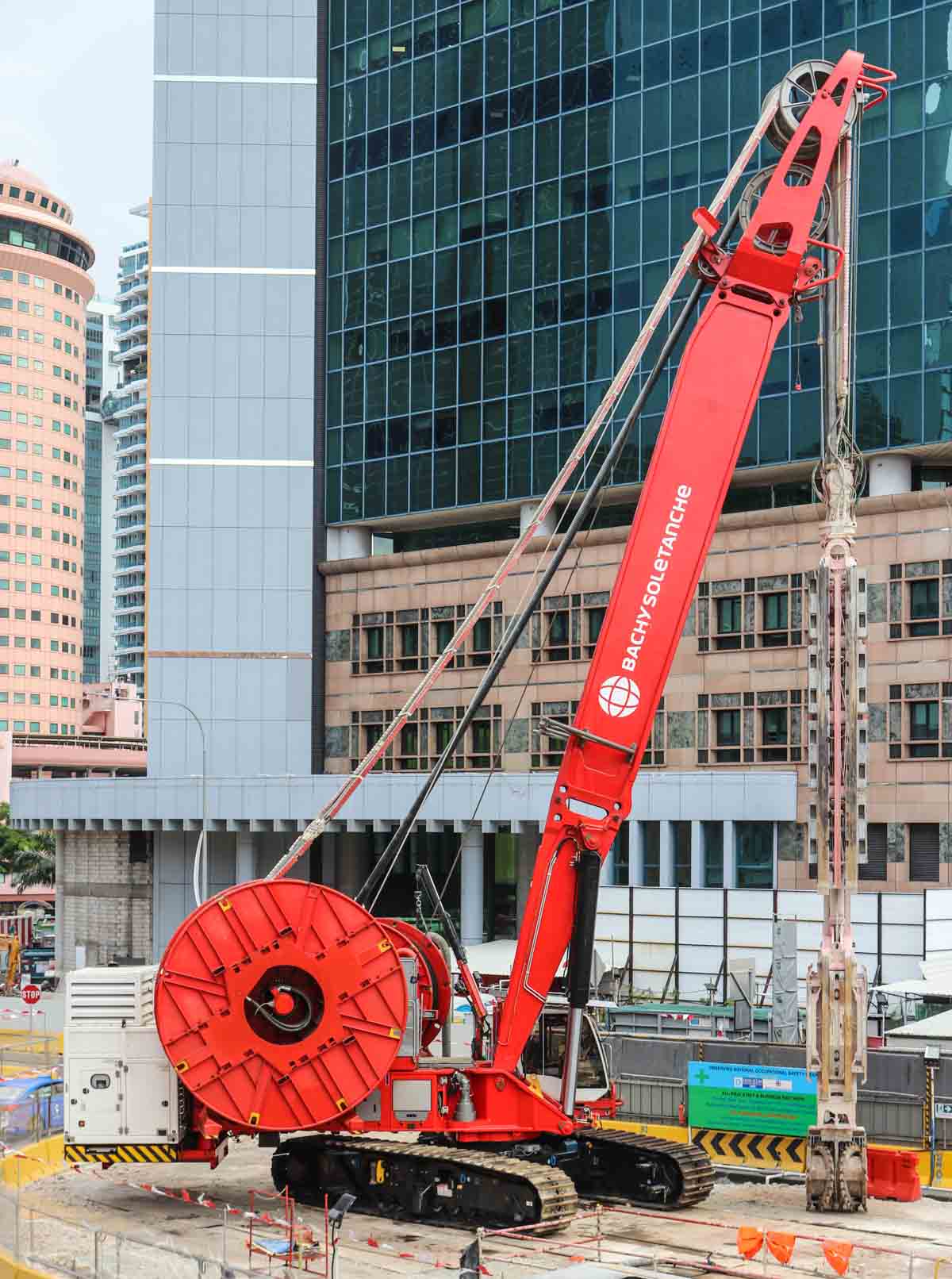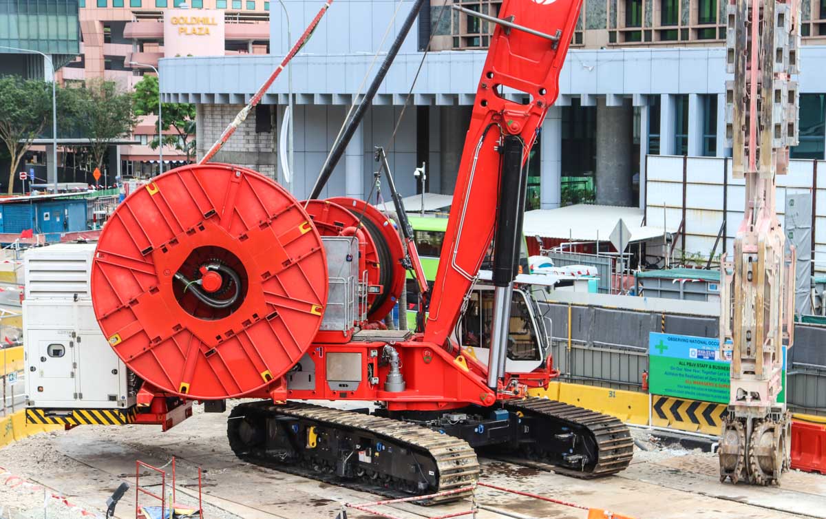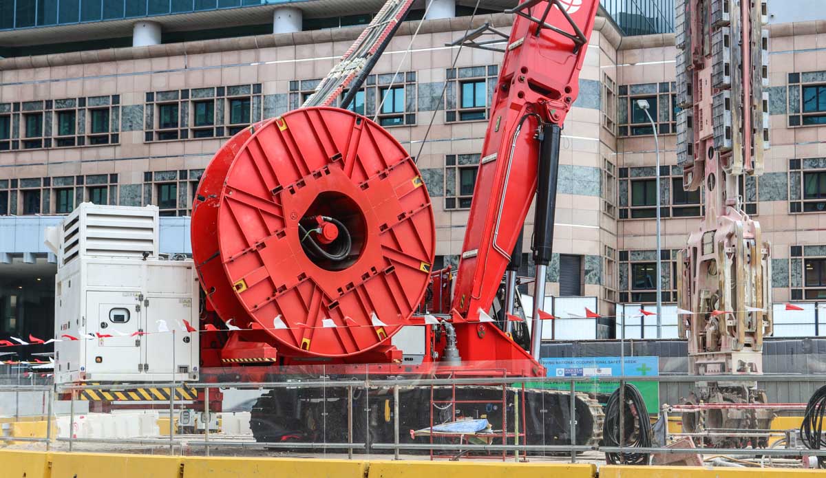 This interesting Hydrofraise HF8 was deployed by Bachy Soletanche for the first time on a major project in Singapore (SG). This machine was developed and built at the Soletanche Bachy headquarters in France. This machine has a total weight of approximately 230 tonnes.
