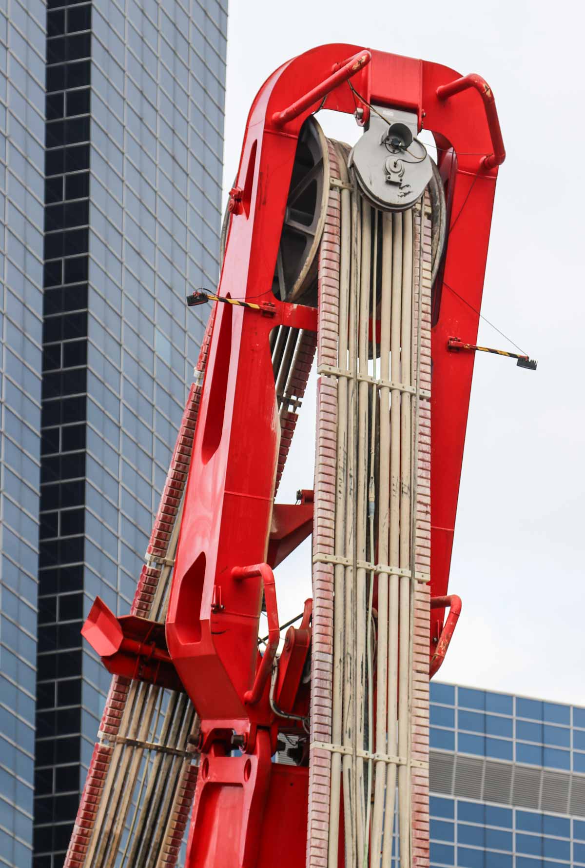 The enormous cutter suspended in the machine is used to construct diaphragm walls. The thickness of the cutter can be configured between 0.8 and 1.8 metres and a width between 2.8 and 3.8 metres. The cutter can be rotated hydraulically in relation to the base machine. The cutter was developed by Soletanche Bachy in order to cutter-excavate in very hard rock, up to 200 MPa.