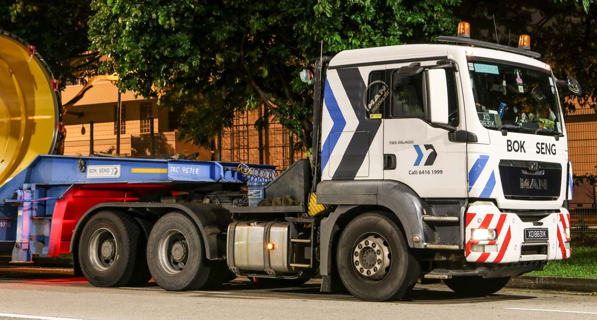 Bok Seng from Singapore (SG) operates several of these interesting MAN TGS 26.400 trucks. This vehicle was traveling with a 2-axle low loader and was parked along the road, waiting for the escort.