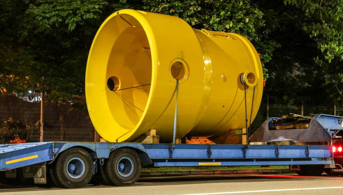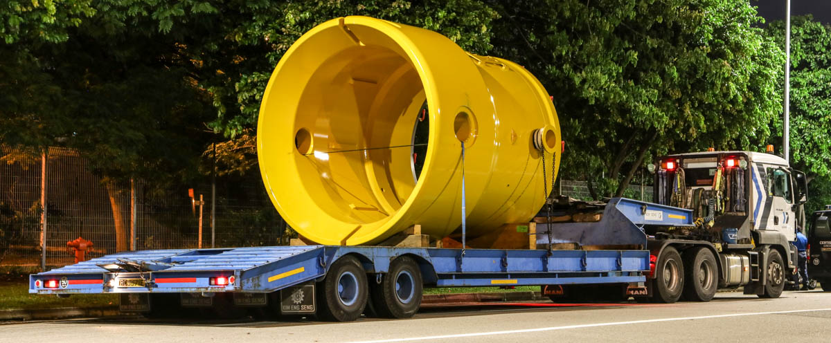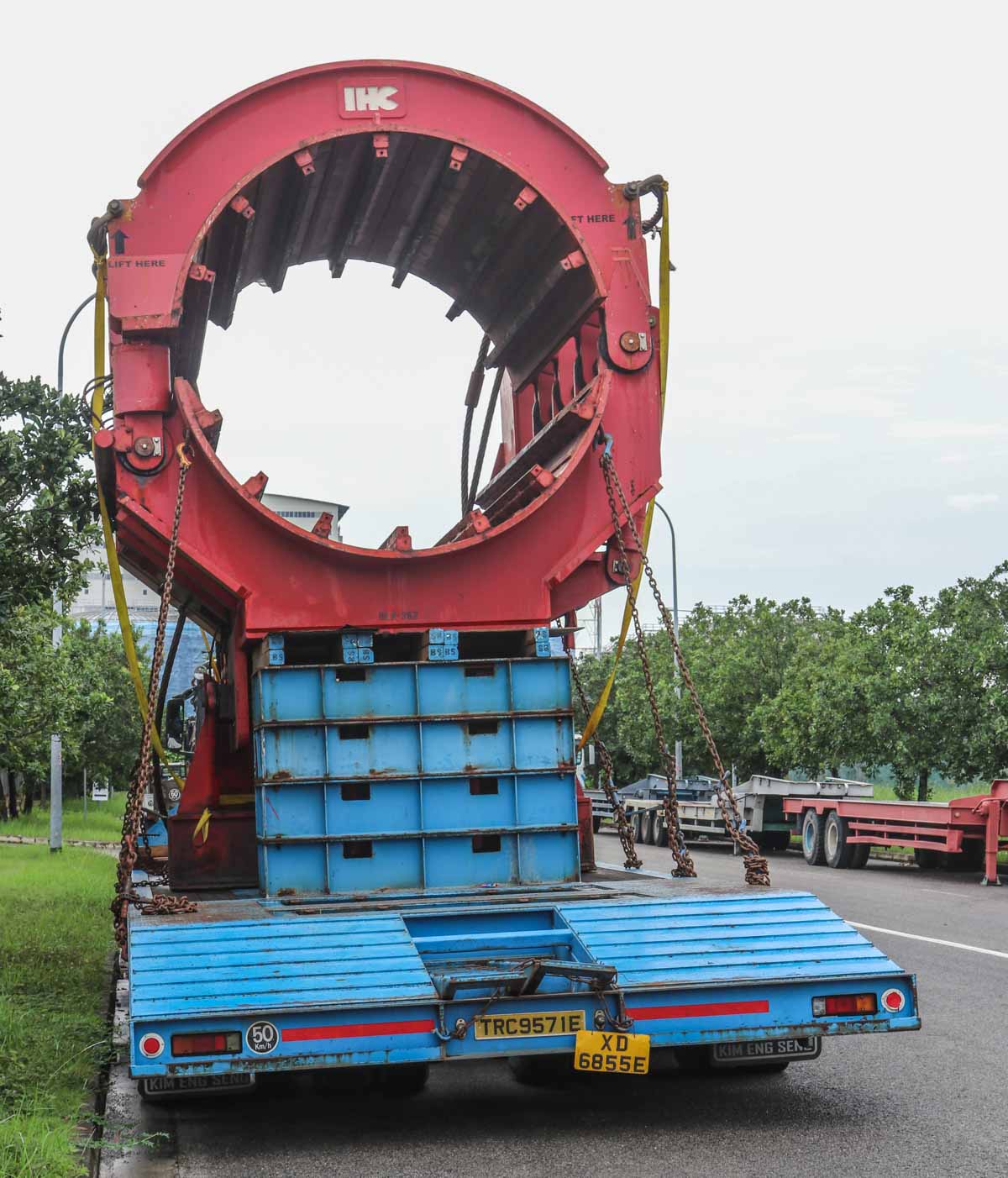 The same Kim Eng Seng trailer as in the previous photos is being used here. The cargo is now a large IHC clamp also used for offshore piling.