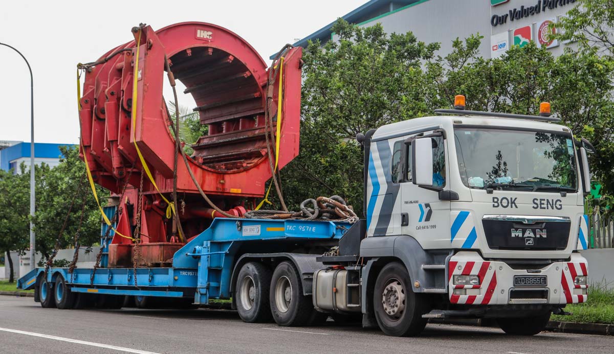 On the three-axle trailer are loaded the coupling frame of 21.5 tons and two ballast blocks of 12.5 tons. Impressive vehicles from Bok Seng!