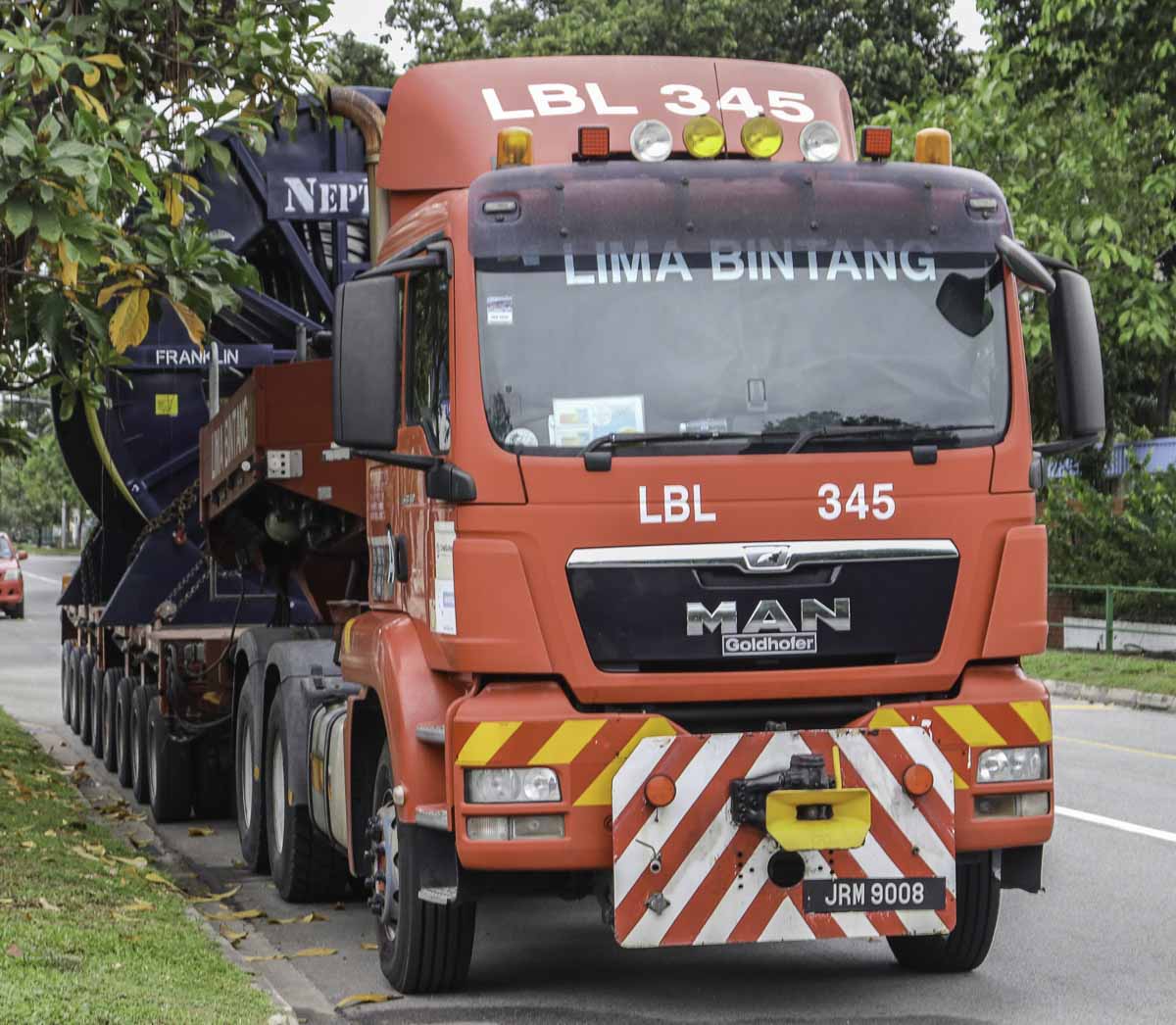A second time I found the sharp MAN TGS 33.480 of Lima Bintang from Johor Bahru (MY) was the truck with a similar cargo on the move. This time was the truck attached to the Goldhofer trailer by a gooseneck.