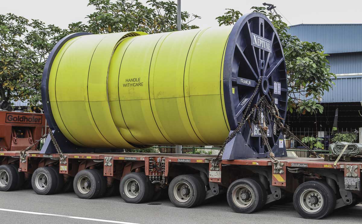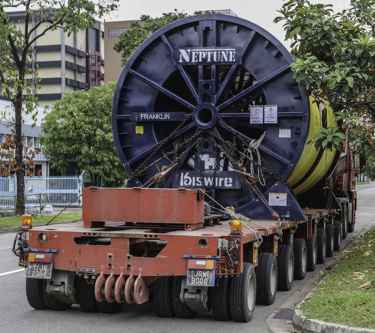 Loaded on the trailer is a large cable reel. On the reel is a hoist wire rope with a length of 867 meters and a diameter of 154 mm coiled. The mass of the cargo is 84.9 tonnes.