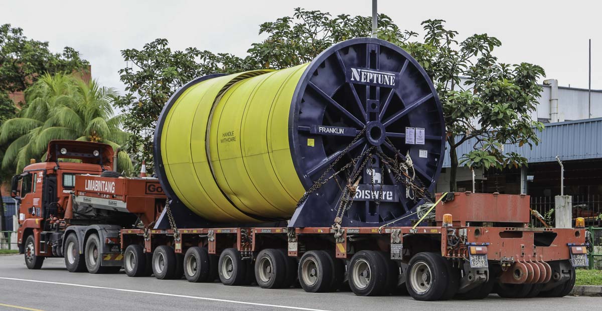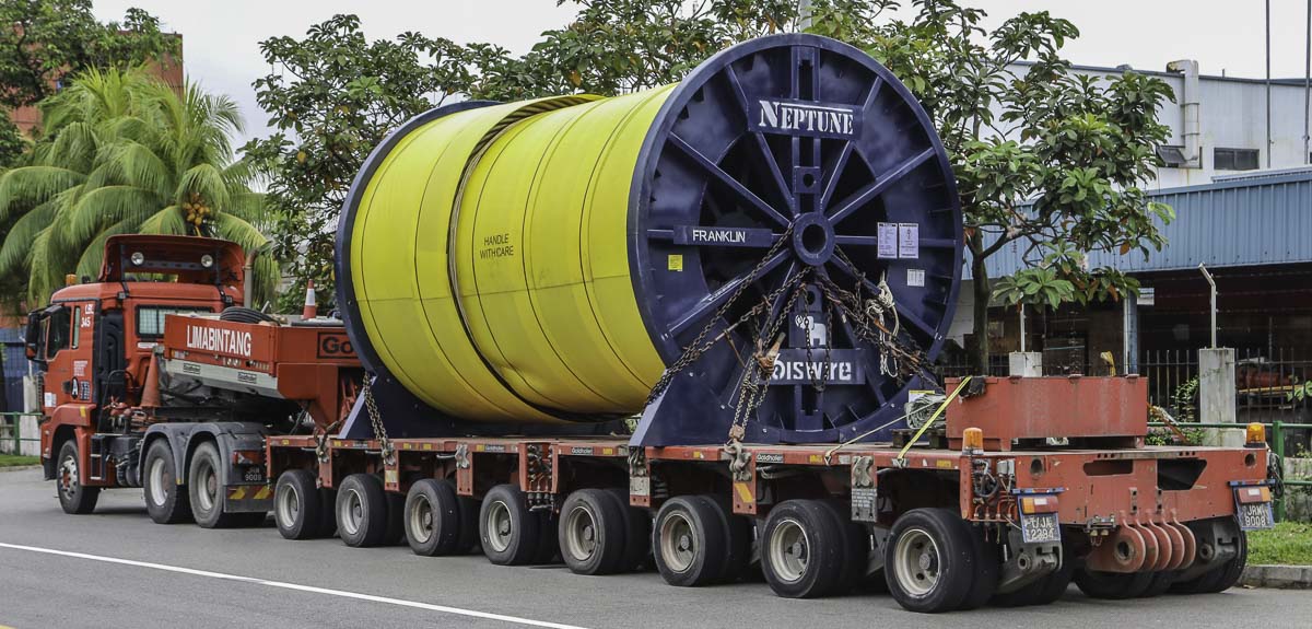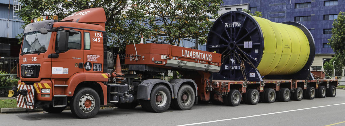This sharp and tough MAN TGS 33.480 belongs to Lima Bintang from Johor Bahru (MY) and was used to deliver a heavy cable reel to Singapore. The combination exists out of a 3-axle truck with an 8-axle towed trailer.