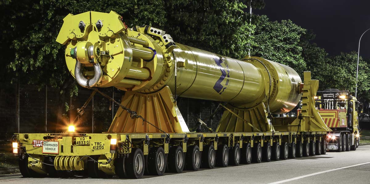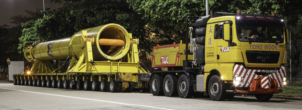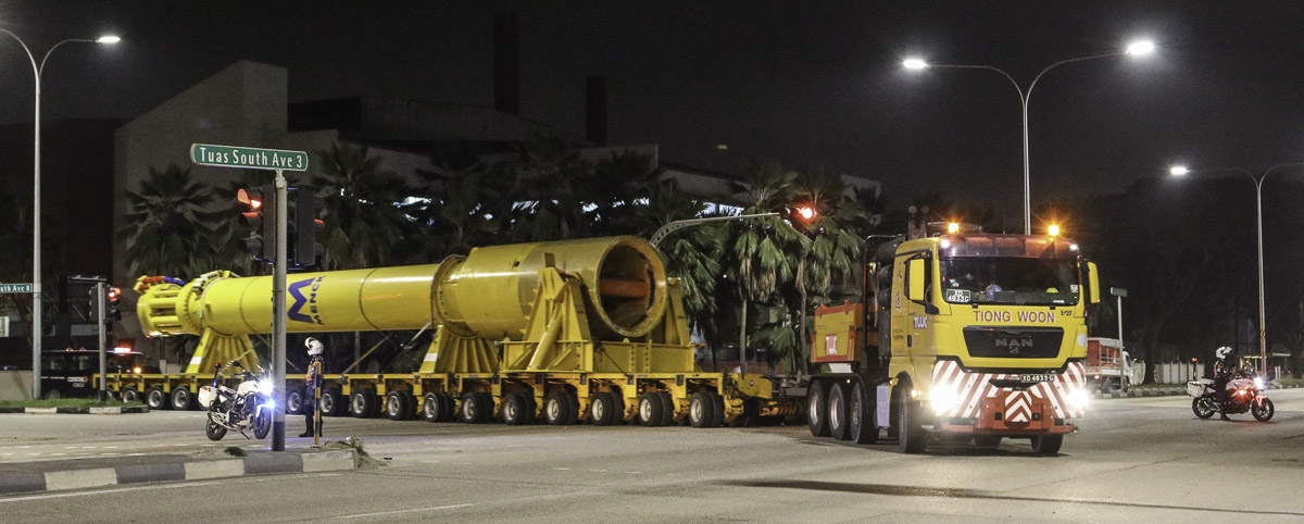Due to the dimensions is this transport only allowed to drive to the other port under escort. In this case only after 10:00 PM. A very sharp transport by Tiong Woon!