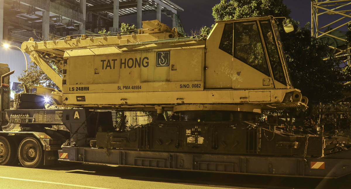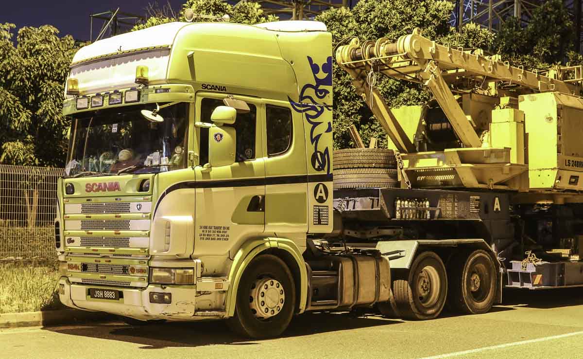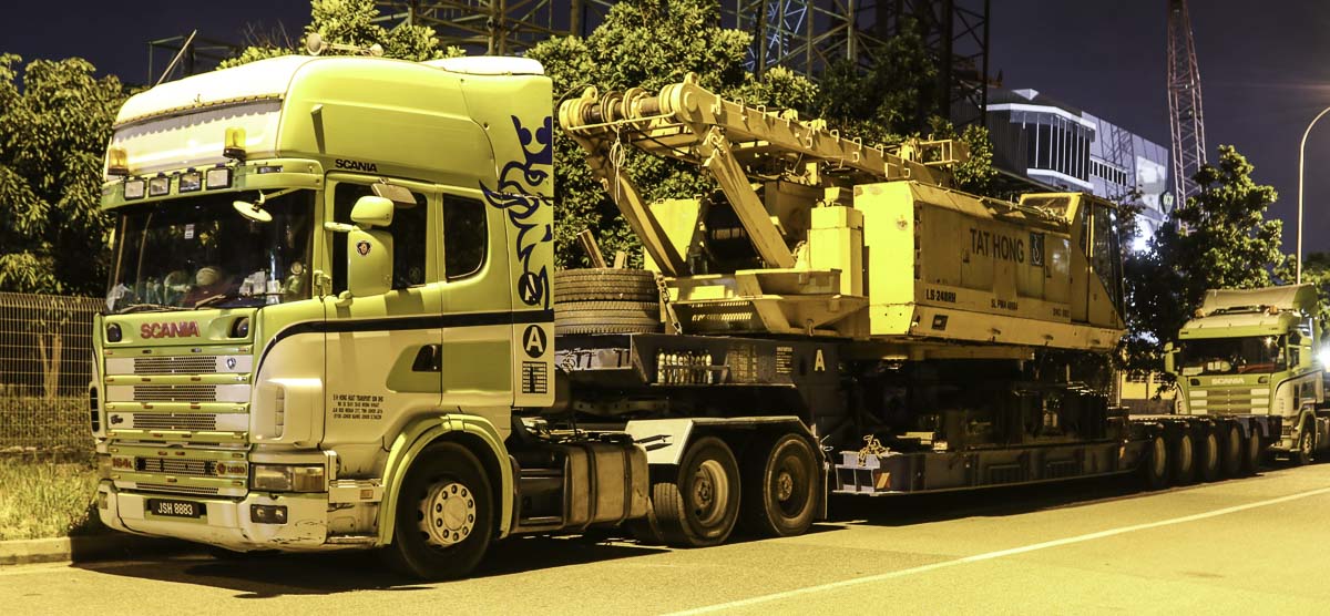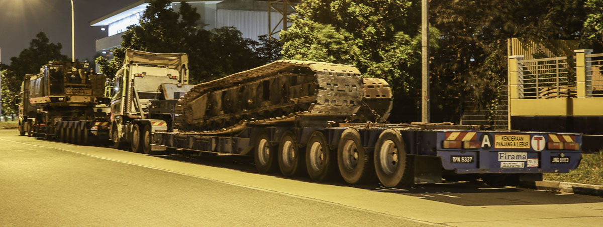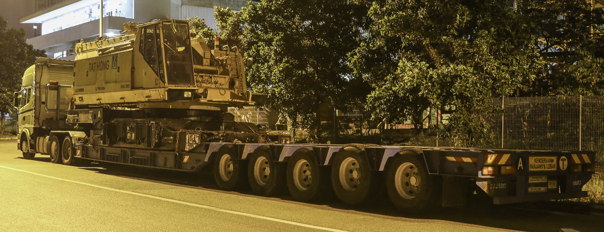 A 5-axle low loader is being towed; the two rear axles can be lifted (in Singapore). In Malaysia, the axles must be activated. All axles are rigid and not steerable. The payload capacity of this combination is approximately 38 tons.