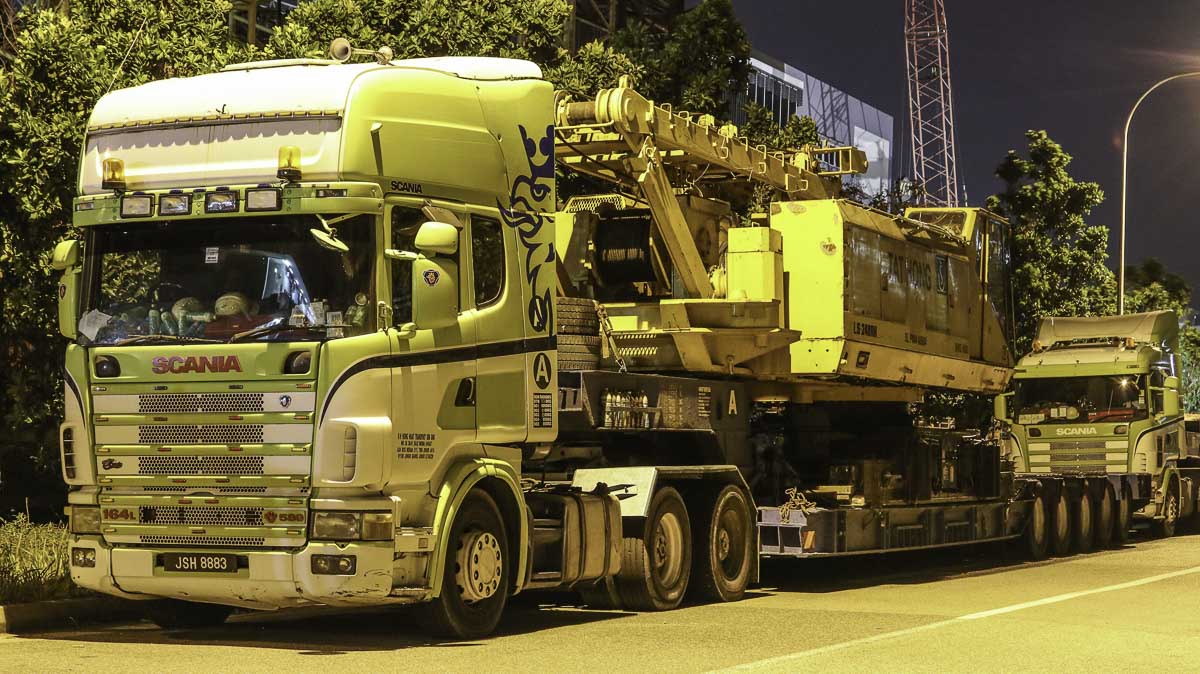 This interesting Scania 164 L 580 belongs to S.H. Hong Huat from Johor Bahru (MY) and was parked in the evening at an industrial site in Singapore (SG). The combination consists of a 3-axle truck with a 5-axle low loader.