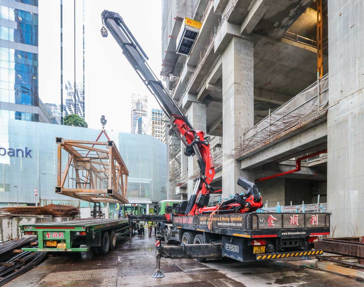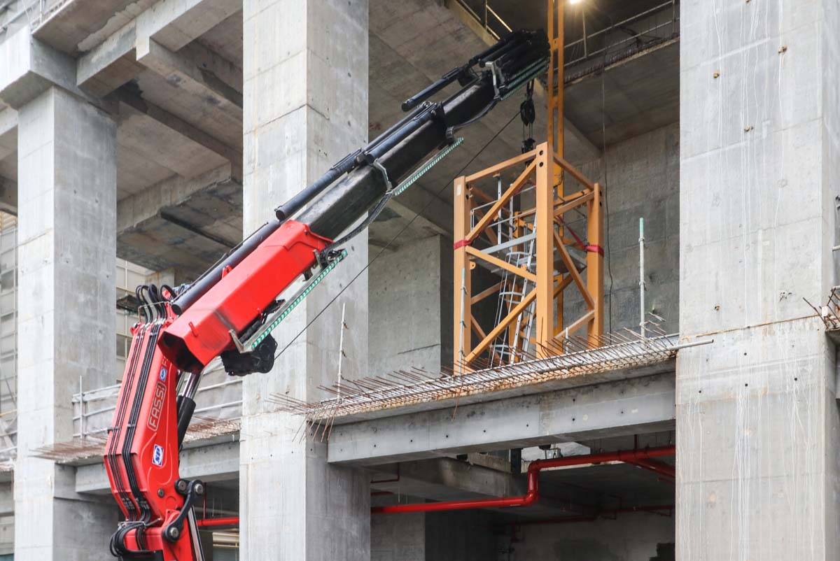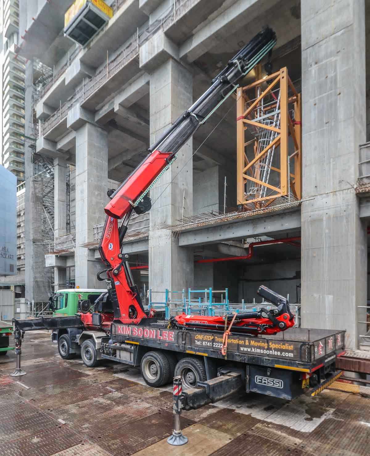 The Fassi was deployed here with a winch and hook block. The winch has a capacity of 5 tonnes and can lift a maximum of 20 tonnes with four falls of rope. Here, the hook block was configured with three falls of rope and the maximum capacity is 15 tonnes. For this job, that was sufficient.