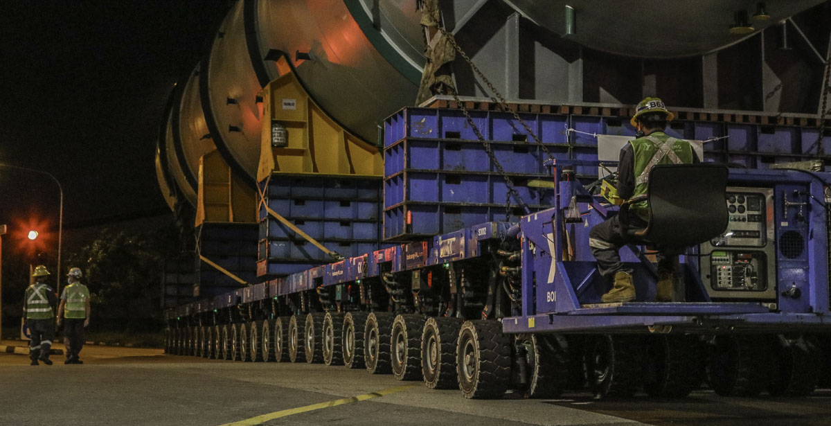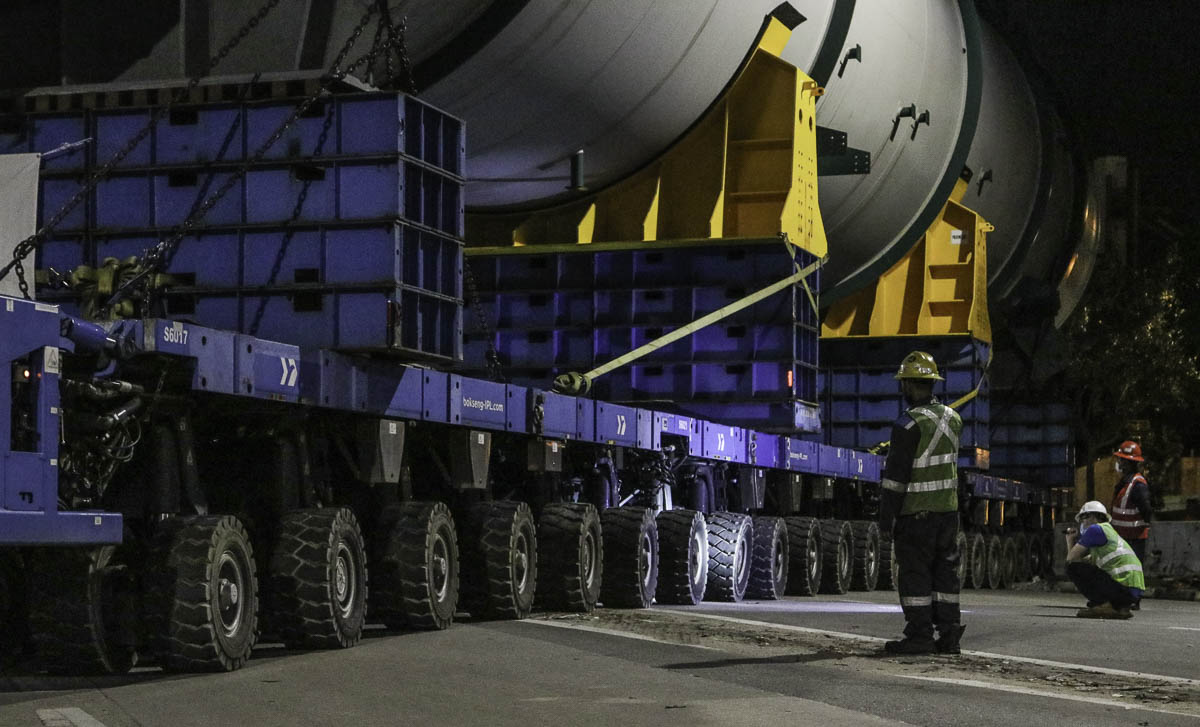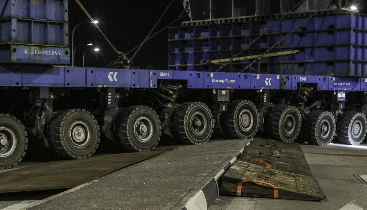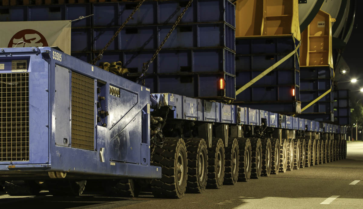 Here is Bok Seng using in total 48 Scheuerle SPMT axles, which are coupled to a double 24-axle transporter. The transporter is powered by two Scheuerle Z350 DA power packs each with a power of 350 kW.