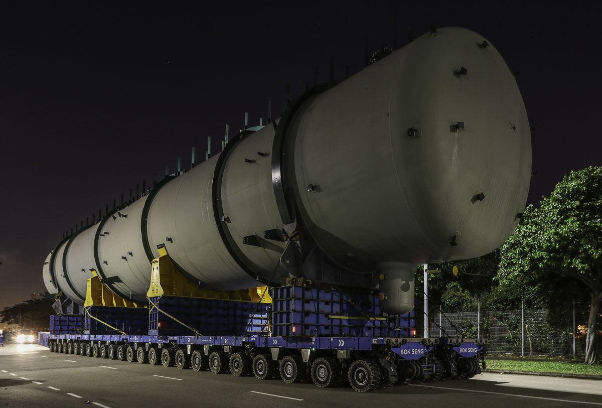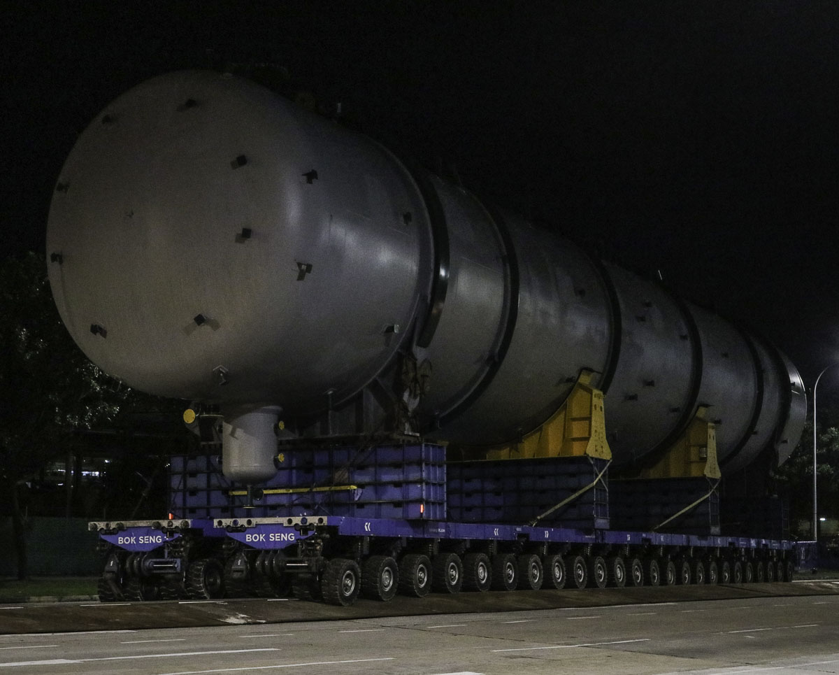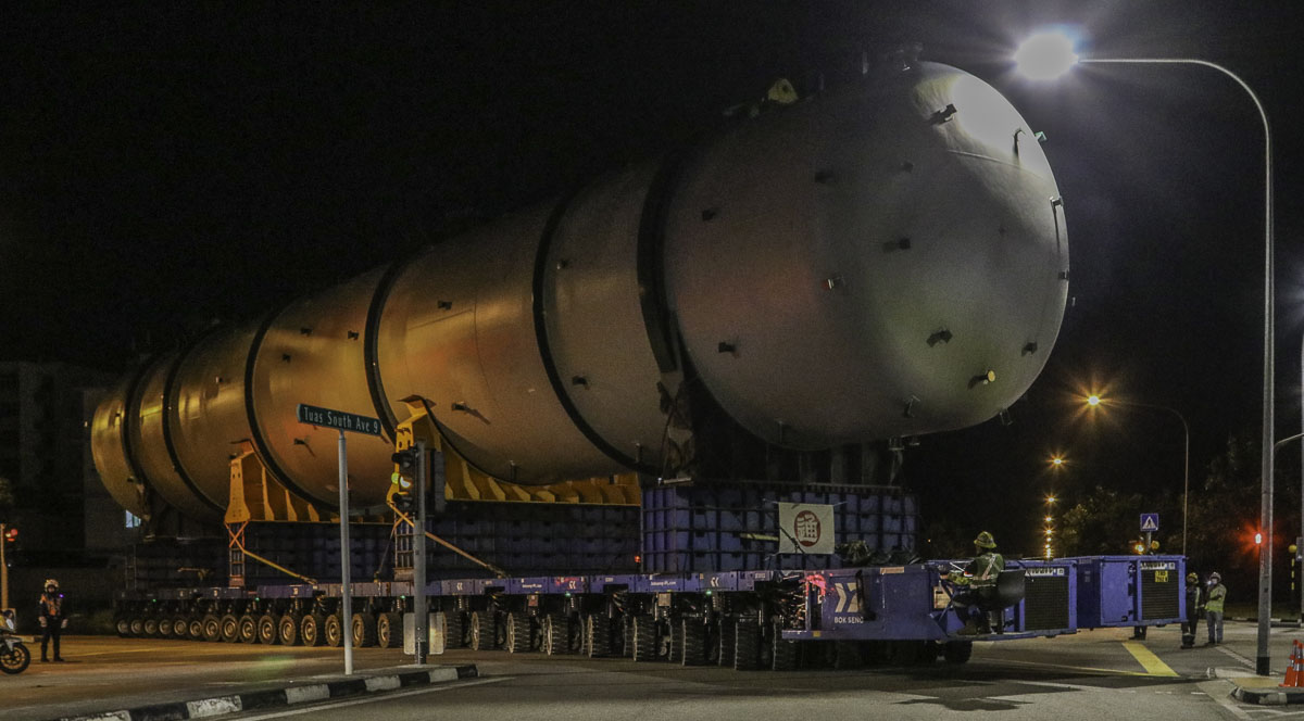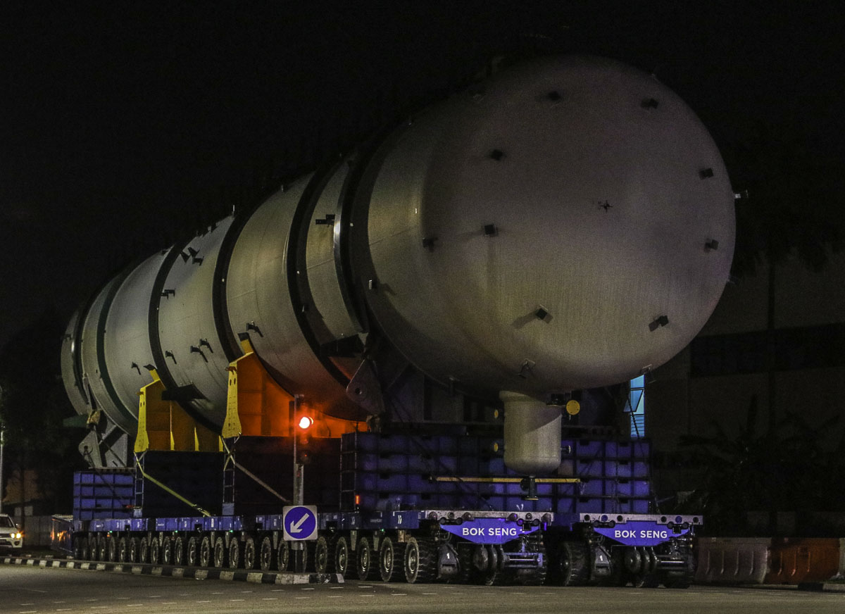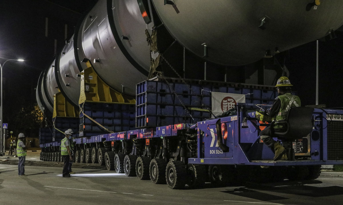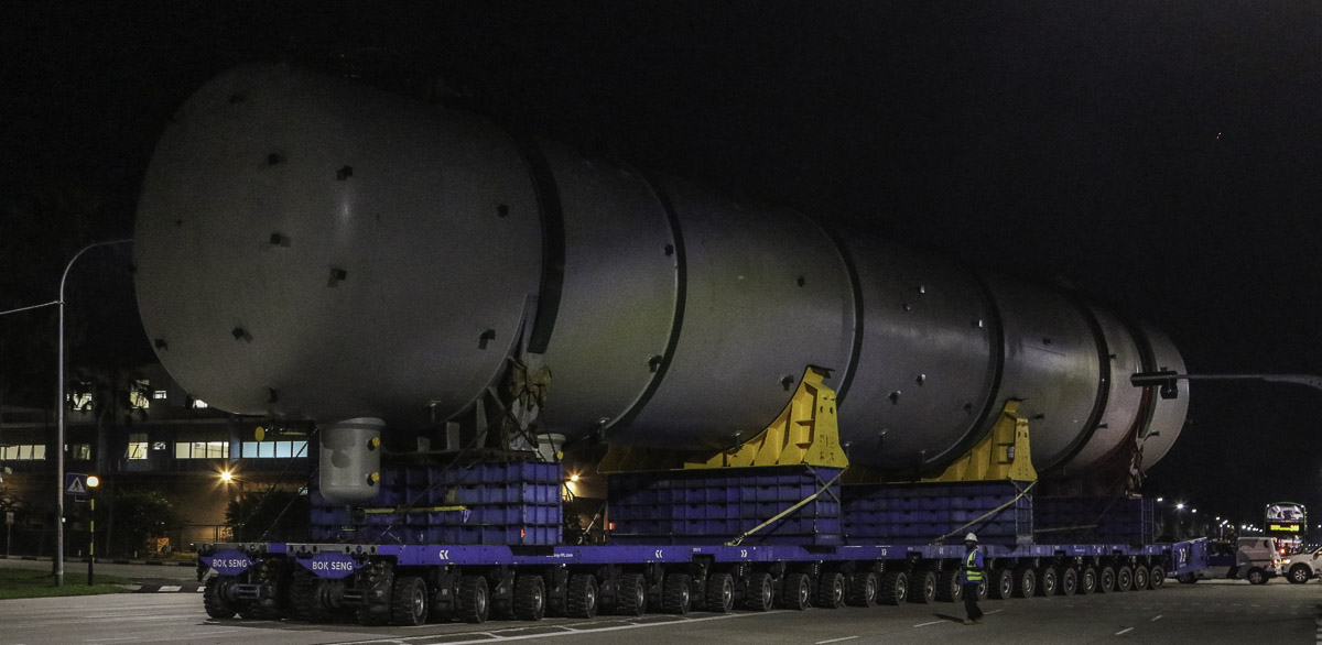 At the end of January 2021 was Bok Seng from Singapore (SG) performing the last of four very large transports for a new refinery in Singapore (SG). The large column was a few days before by four cranes rotated.