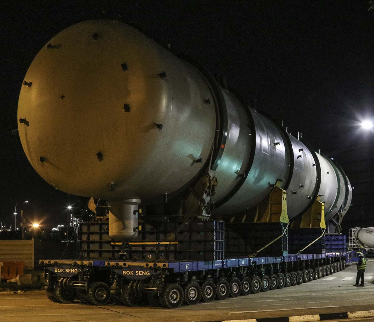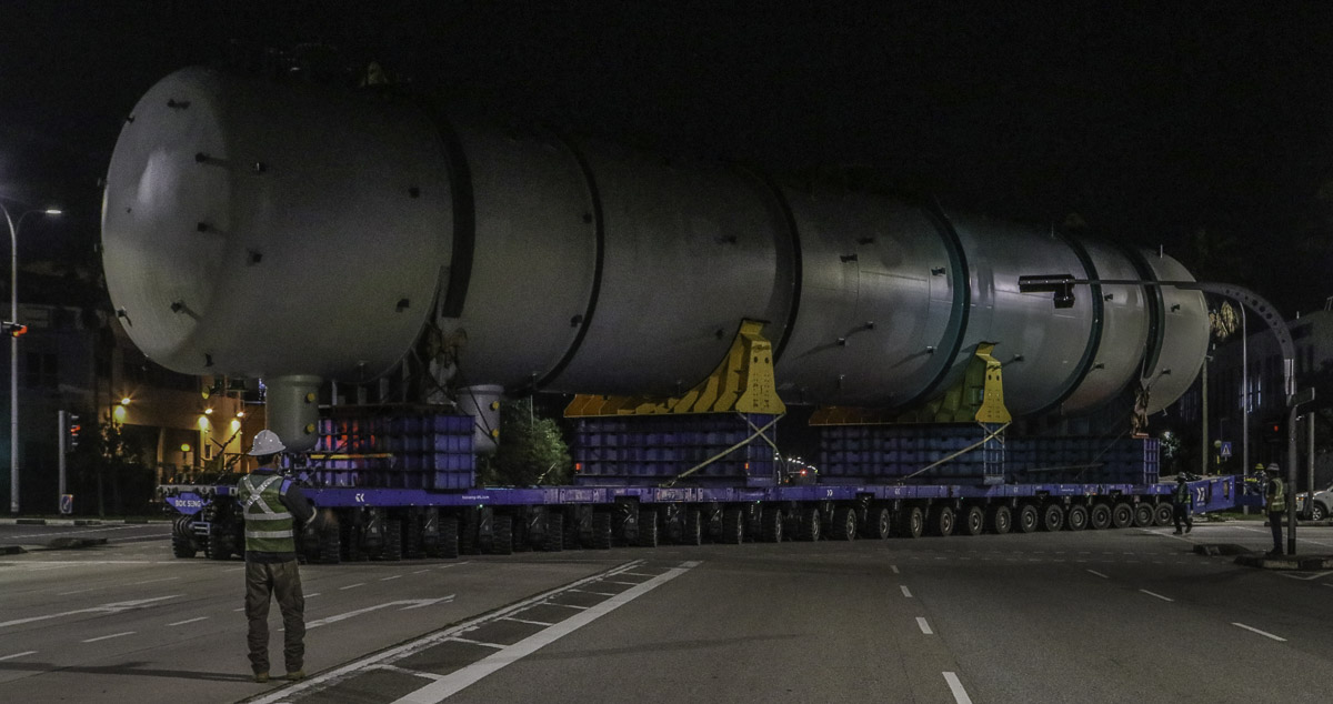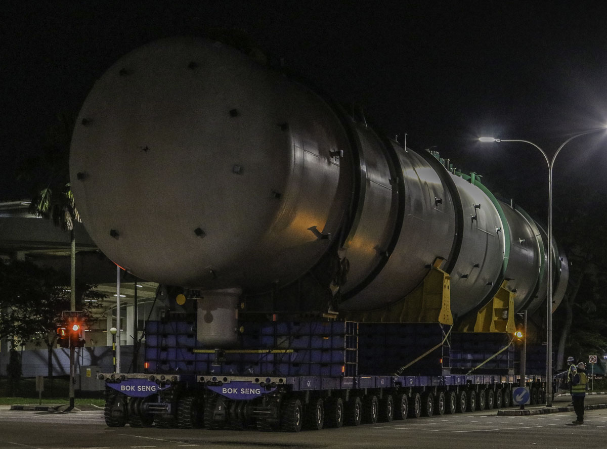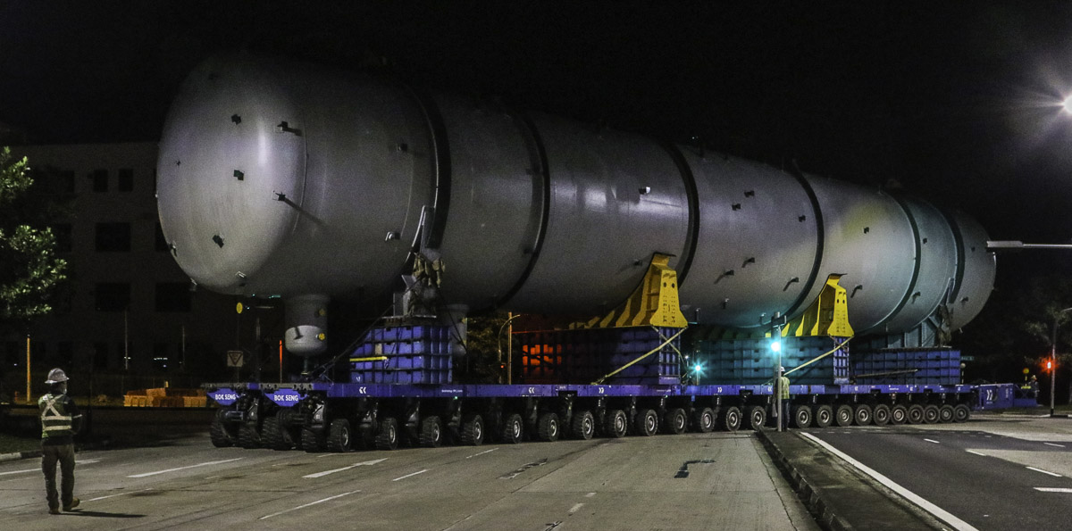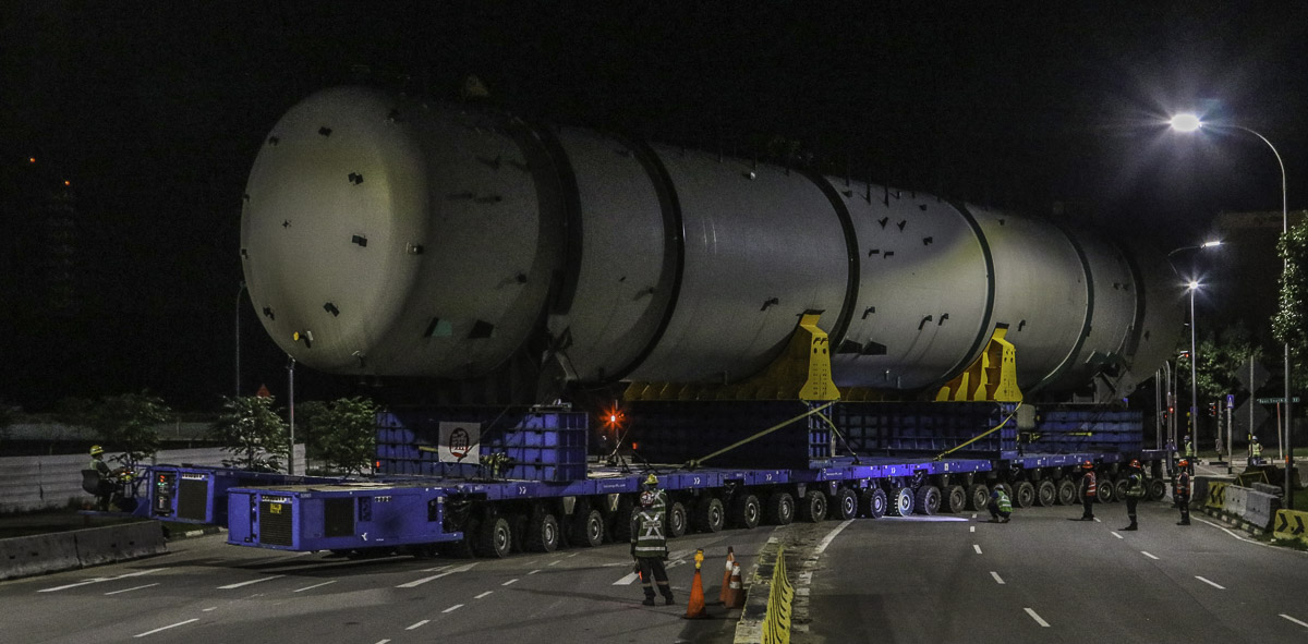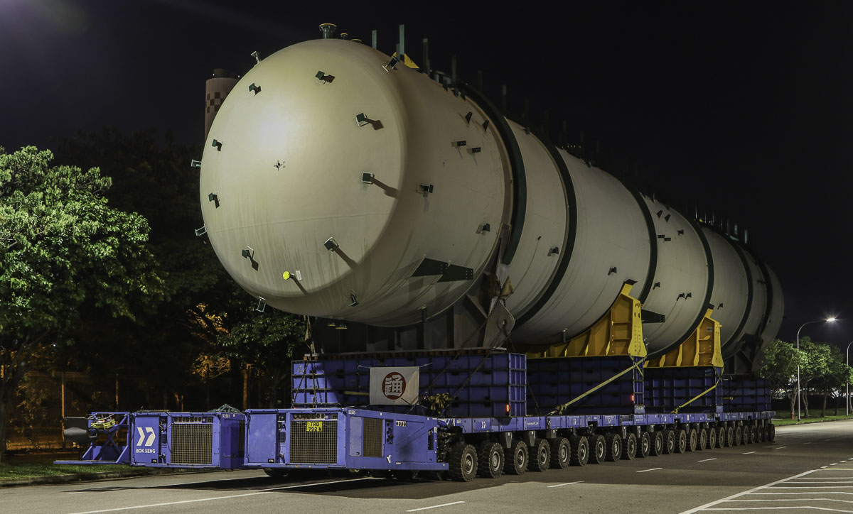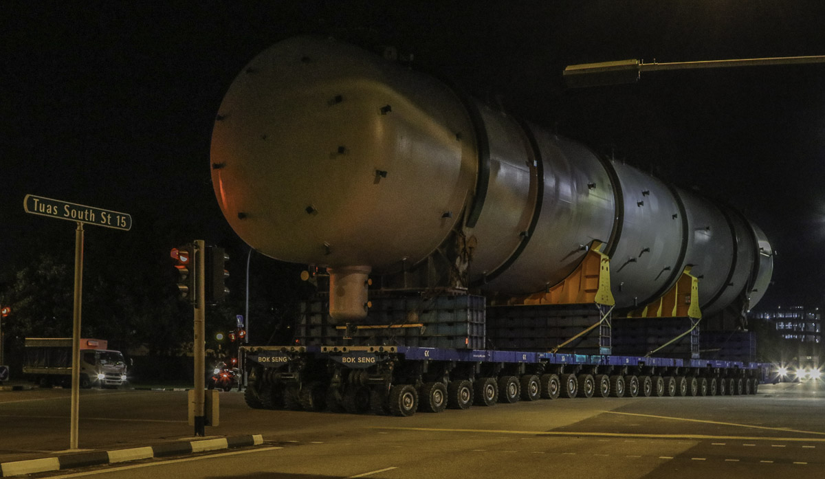 At the end of January 2021 was Bok Seng from Singapore (SG) performing the last of four very large transports for a new refinery in Singapore (SG). The large column was a few days before by four cranes rotated.