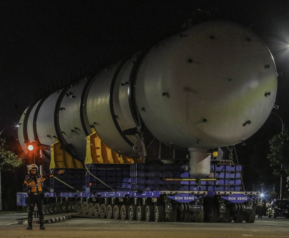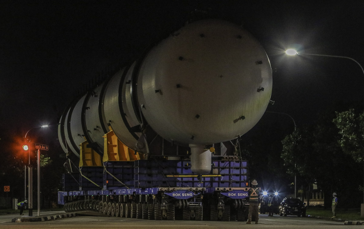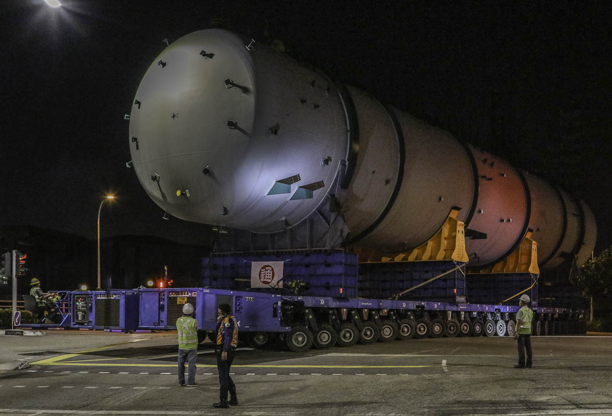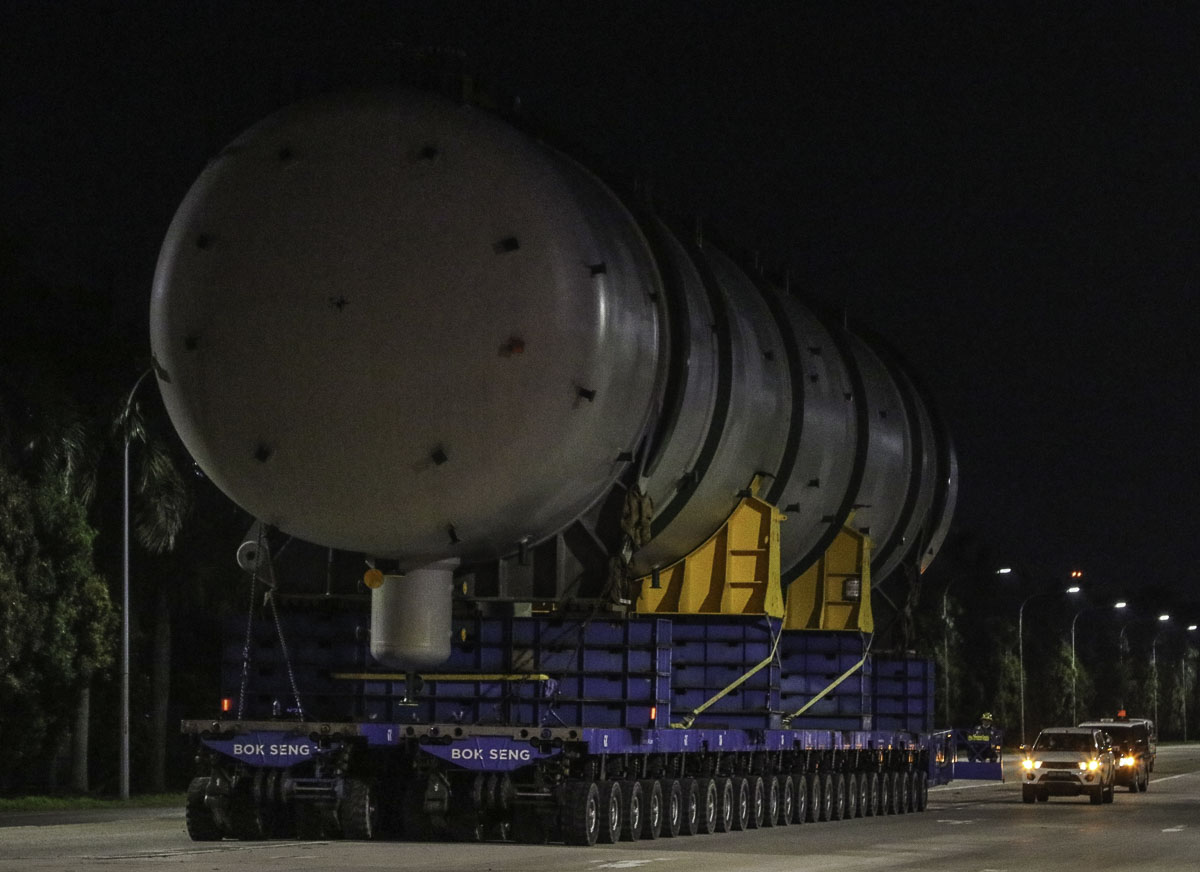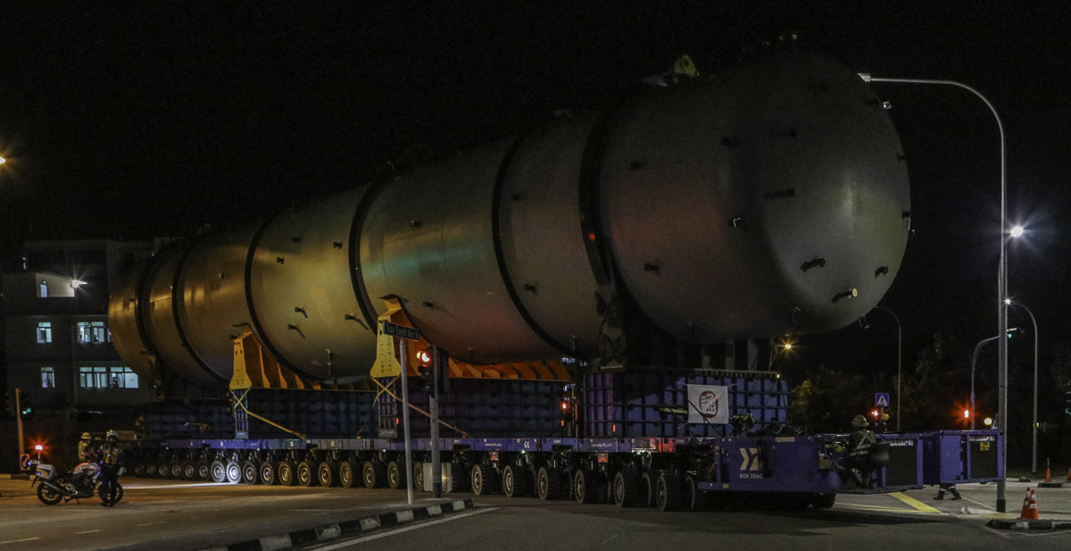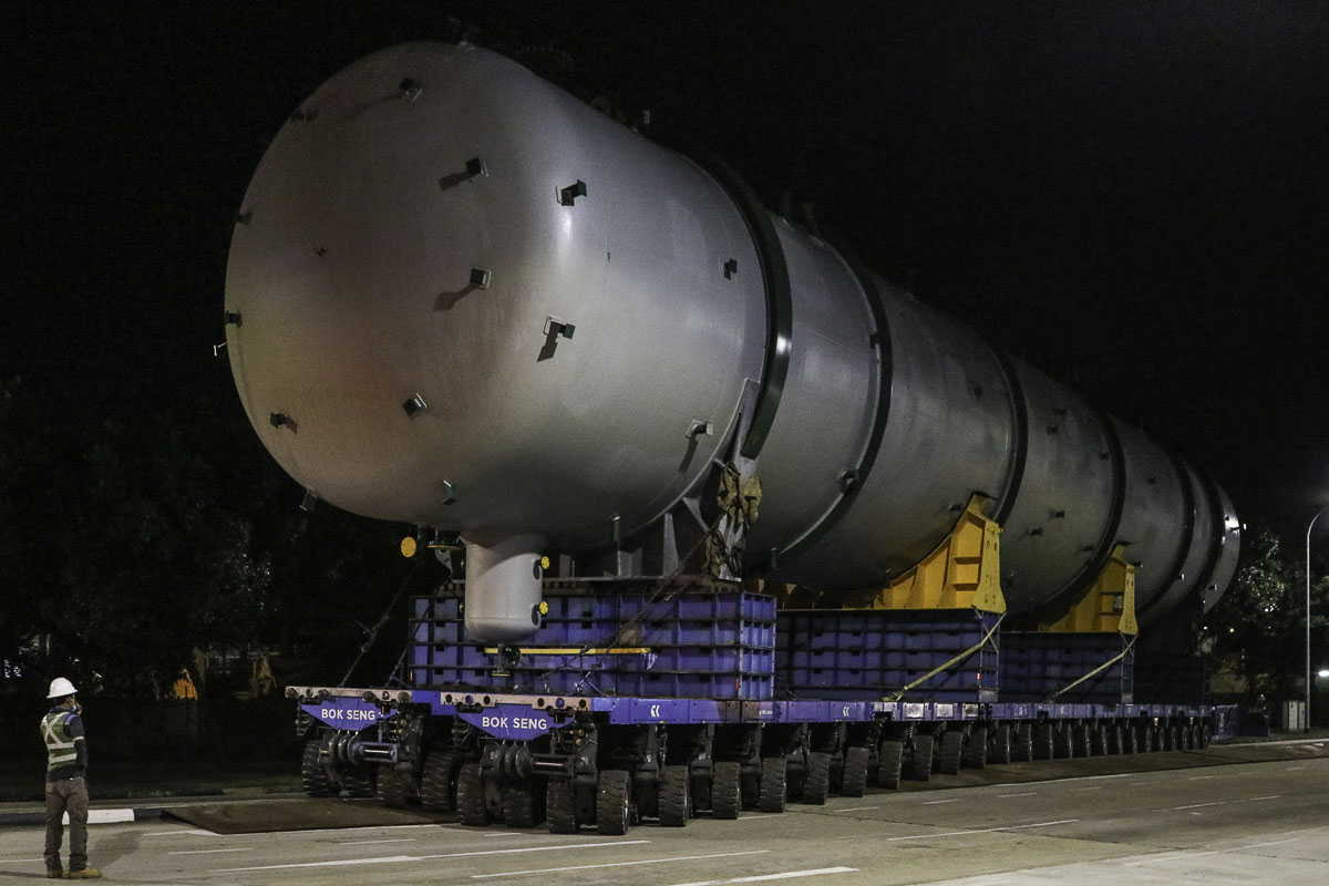 At the end of January 2021 was Bok Seng from Singapore (SG) performing the last of four very large transports for a new refinery in Singapore (SG). The large column was a few days before by four cranes rotated.
