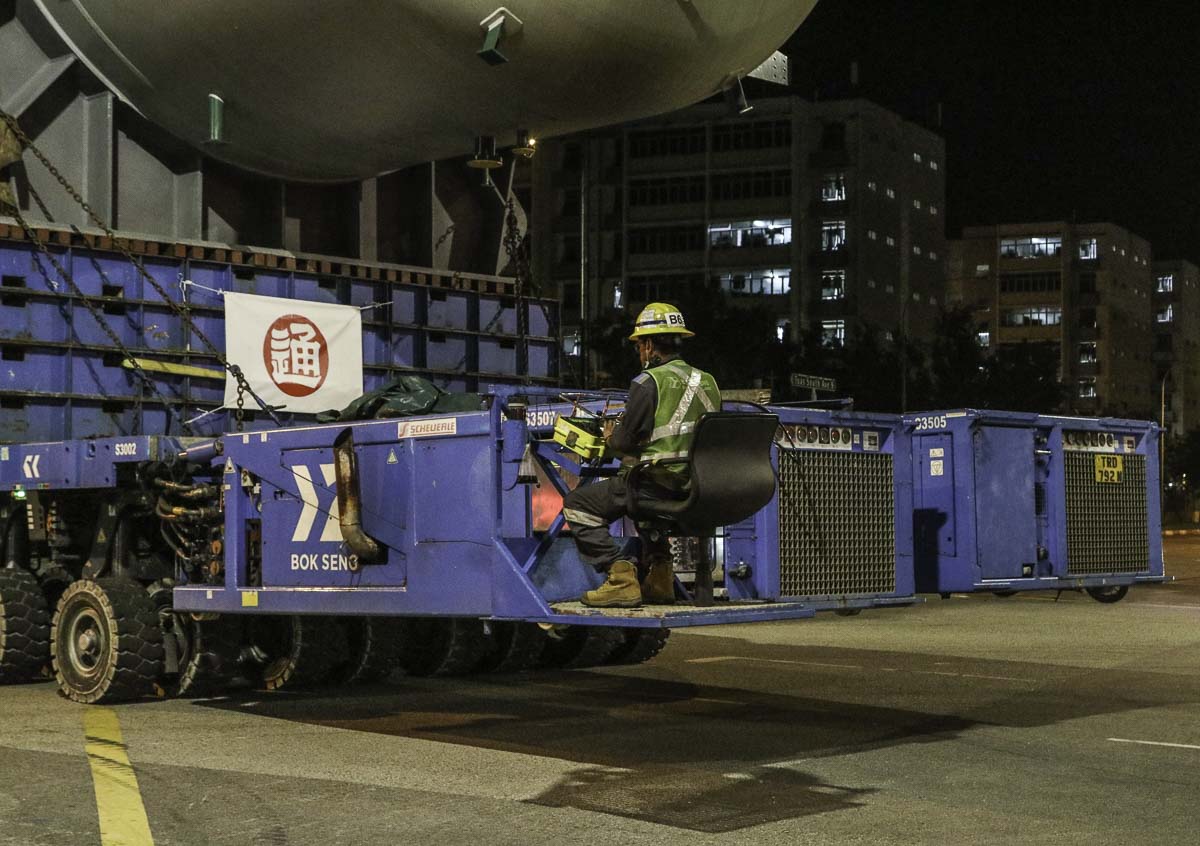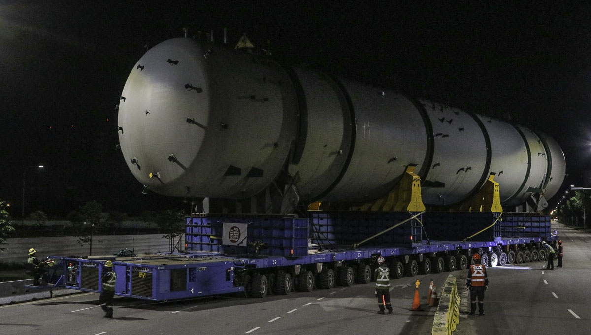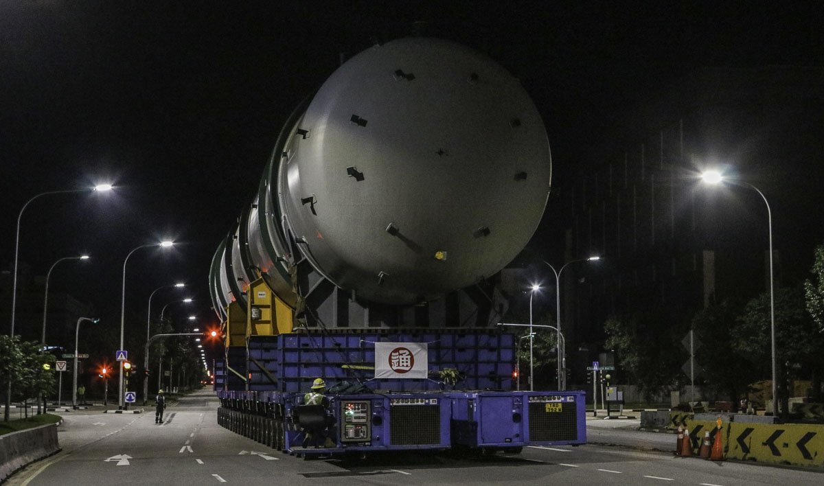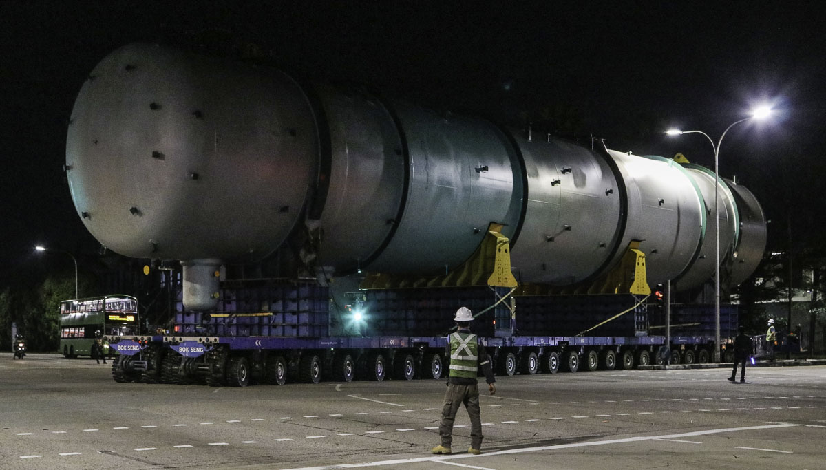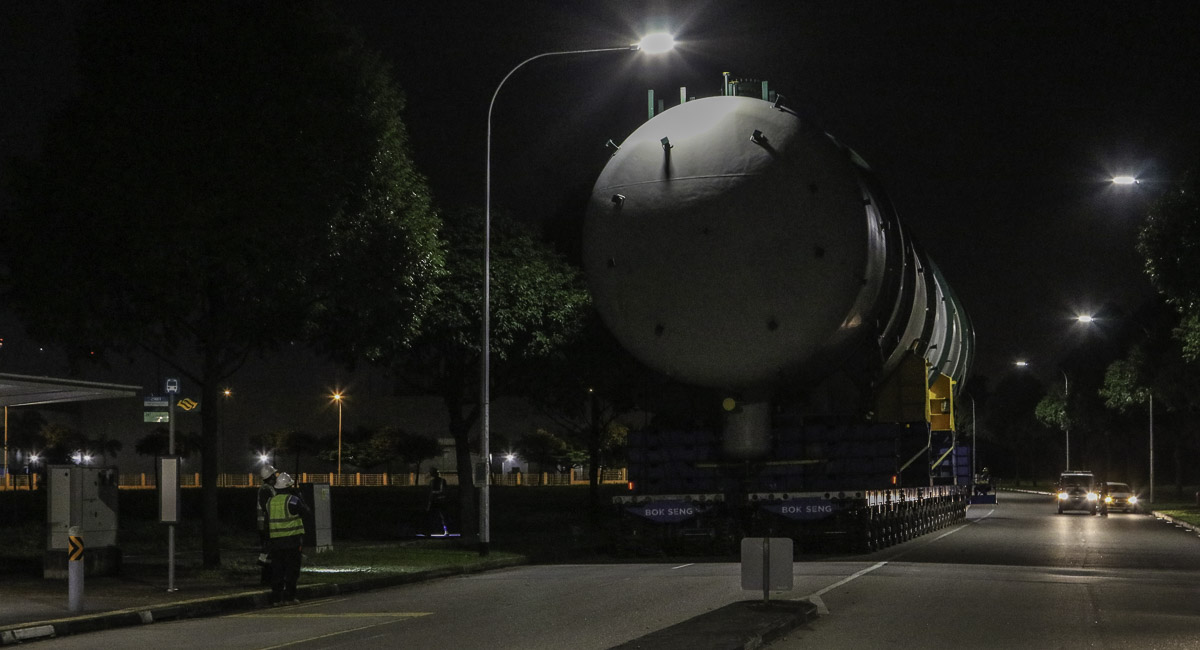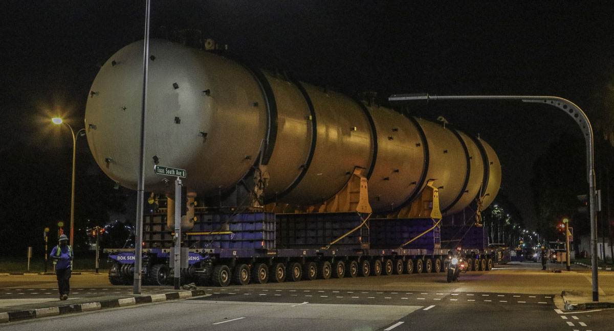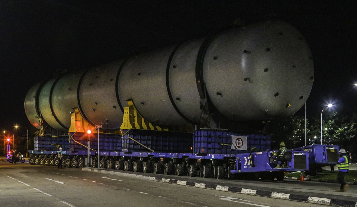 At the end of January 2021 was Bok Seng from Singapore (SG) performing the last of four very large transports for a new refinery in Singapore (SG). The large column was a few days before by four cranes rotated.