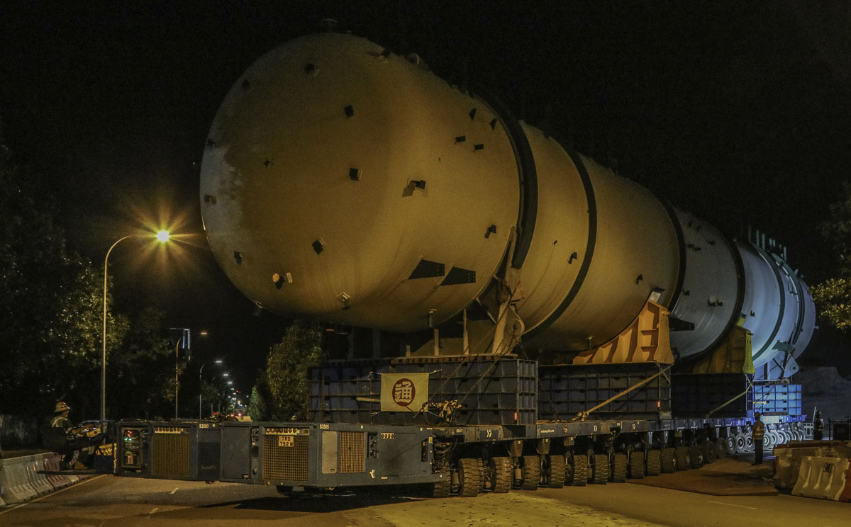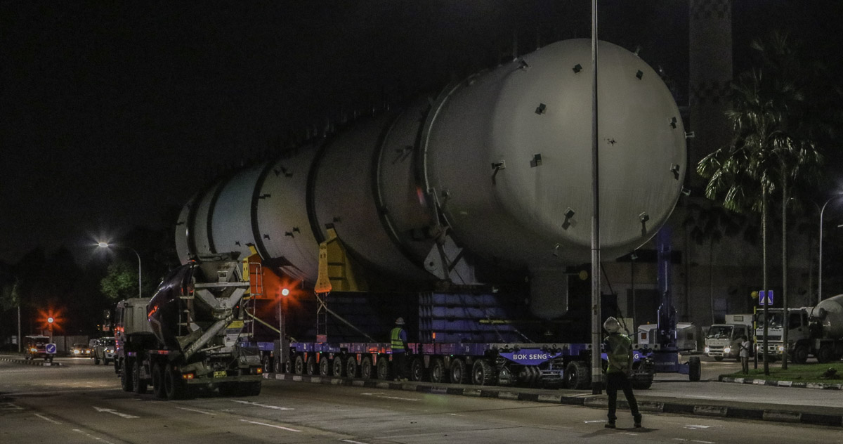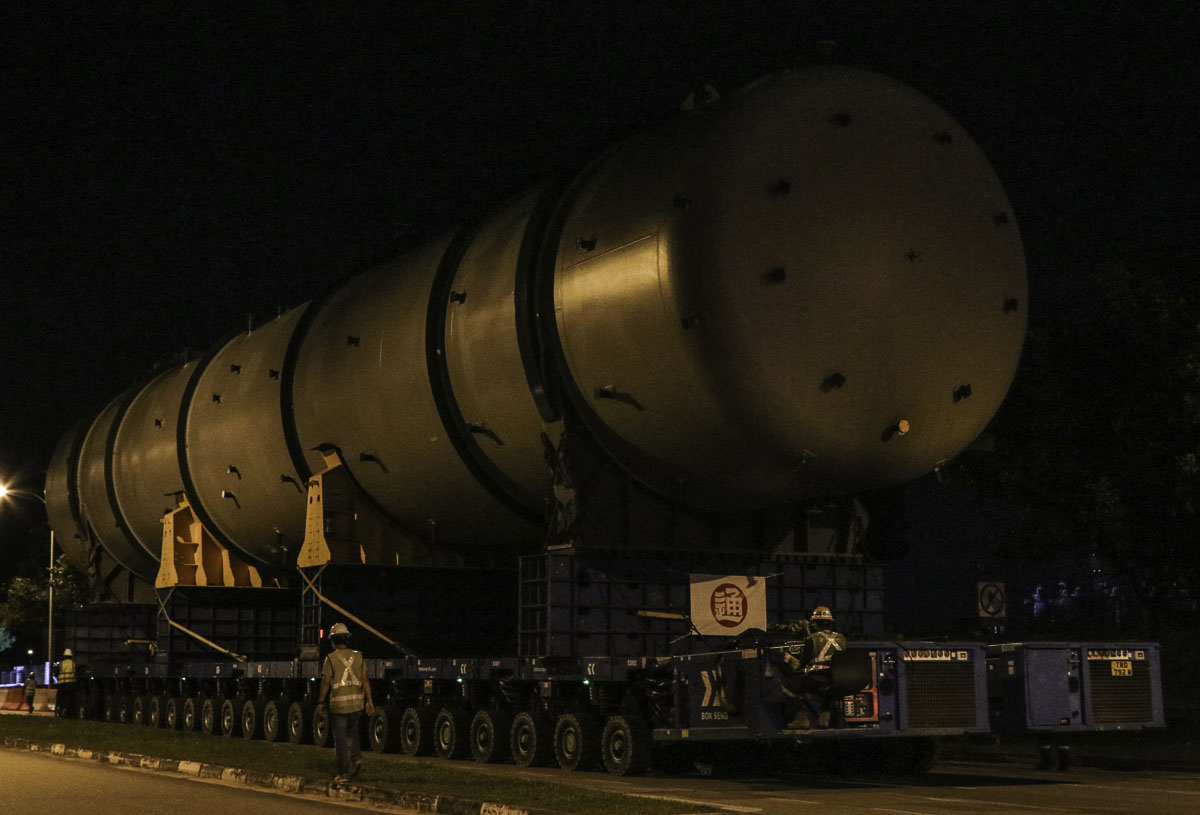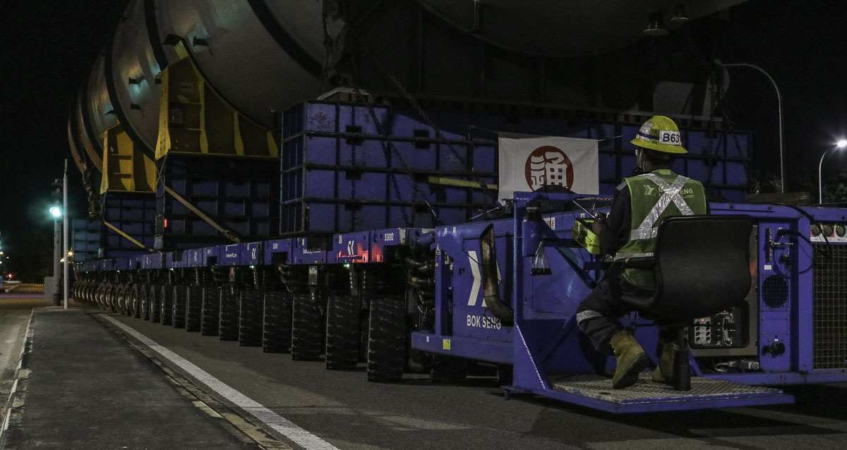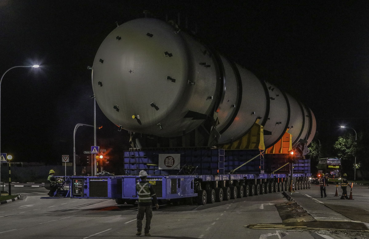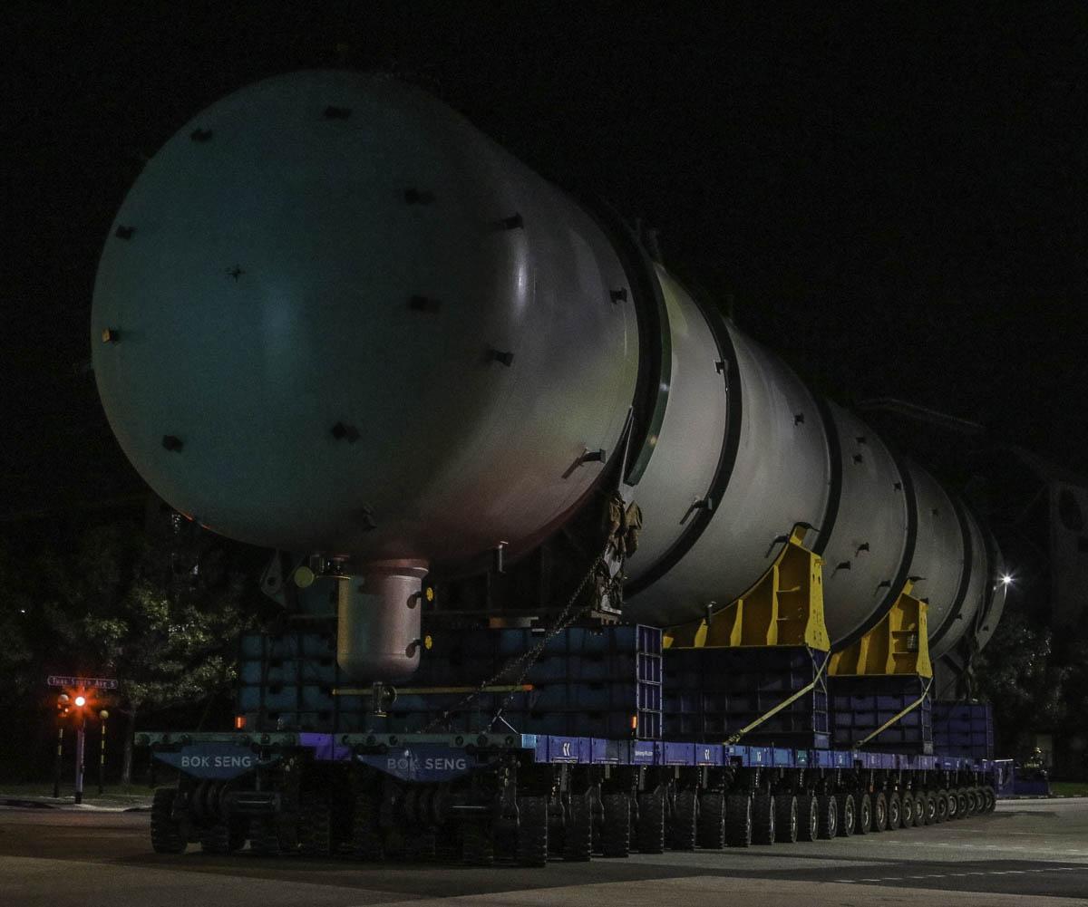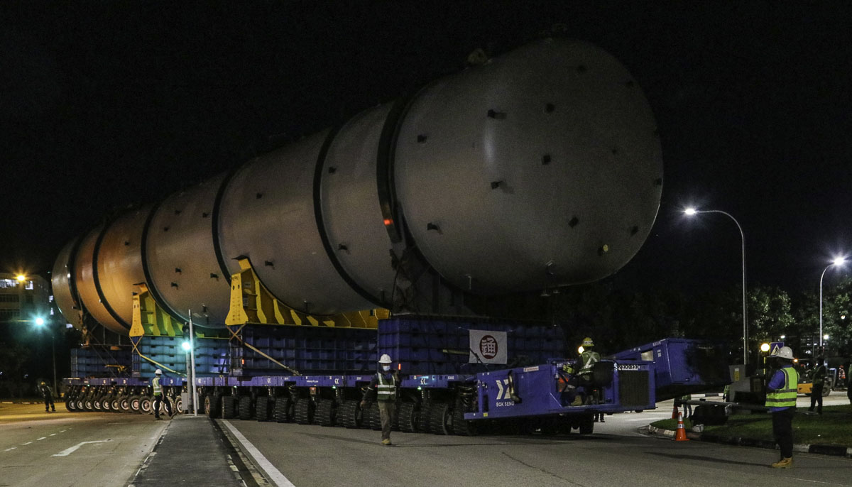 At the end of January 2021 was Bok Seng from Singapore (SG) performing the last of four very large transports for a new refinery in Singapore (SG). The large column was a few days before by four cranes rotated.