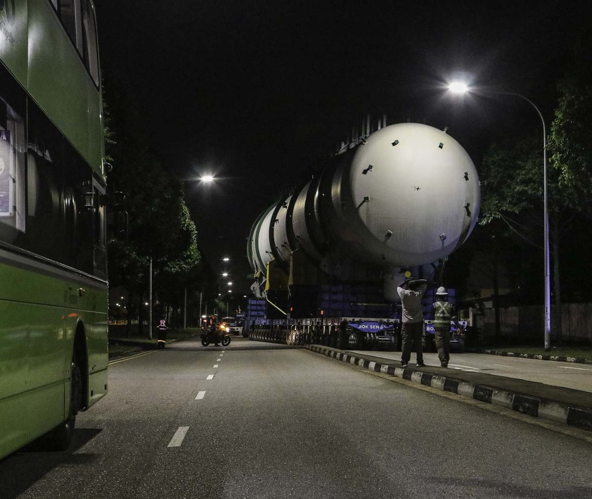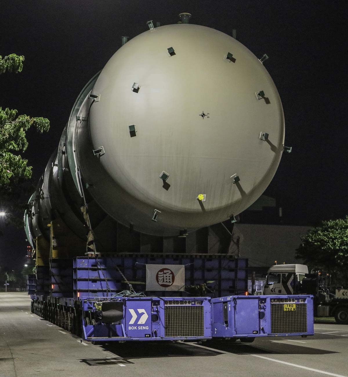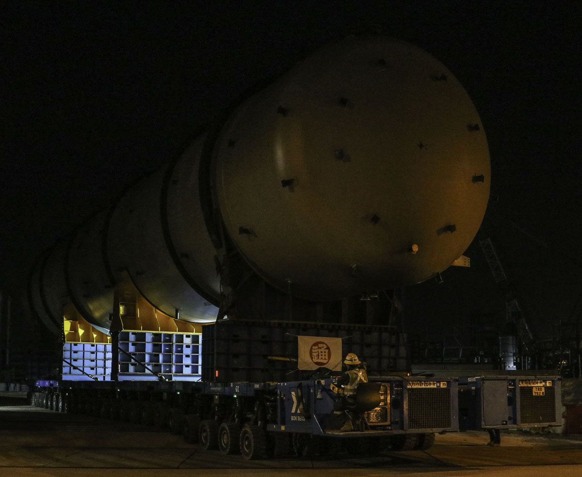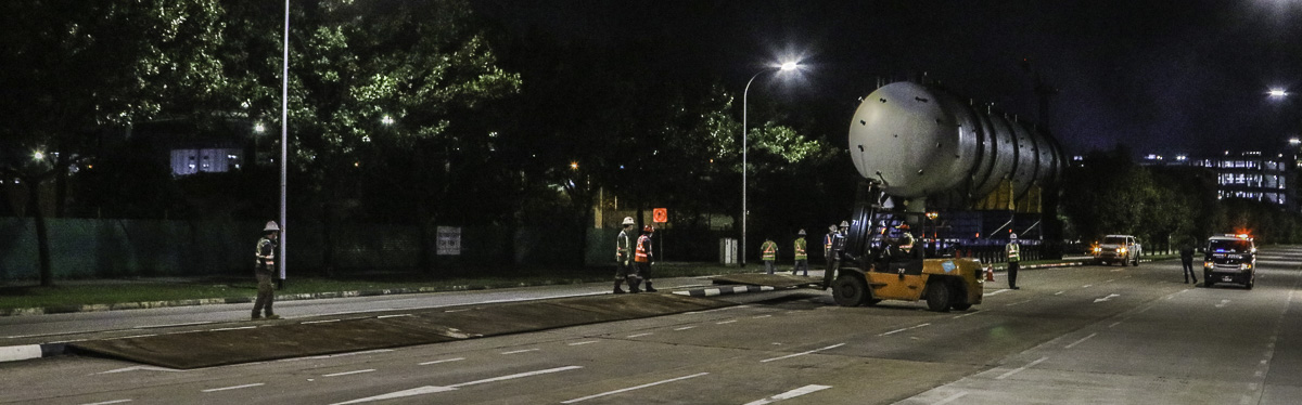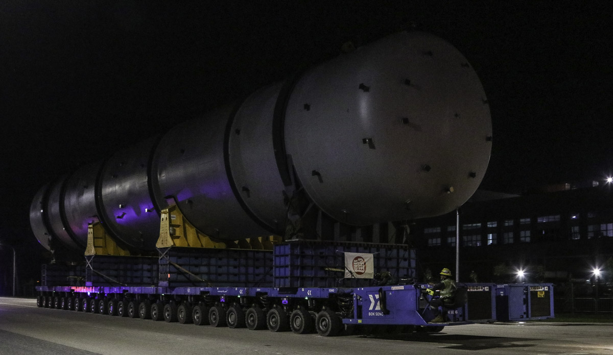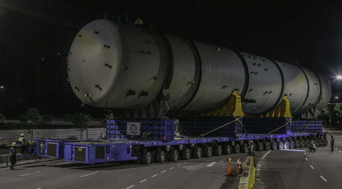 At the end of January 2021 was Bok Seng from Singapore (SG) performing the last of four very large transports for a new refinery in Singapore (SG). The large column was a few days before by four cranes rotated.