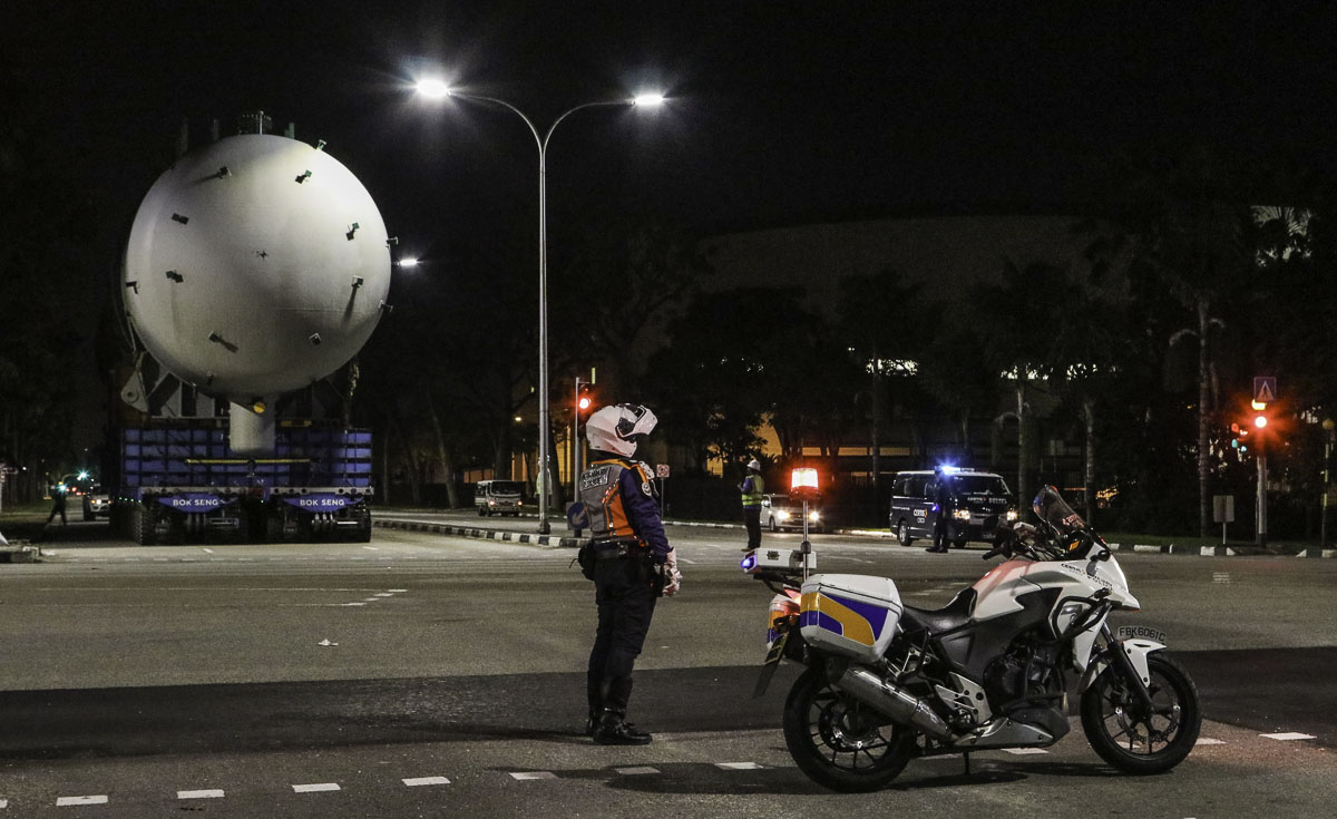 The transport now turns into Tuas South Ave 14, the transport will drive now against the normal flow of traffic. The road is now closed by the Auxilairy Police.
