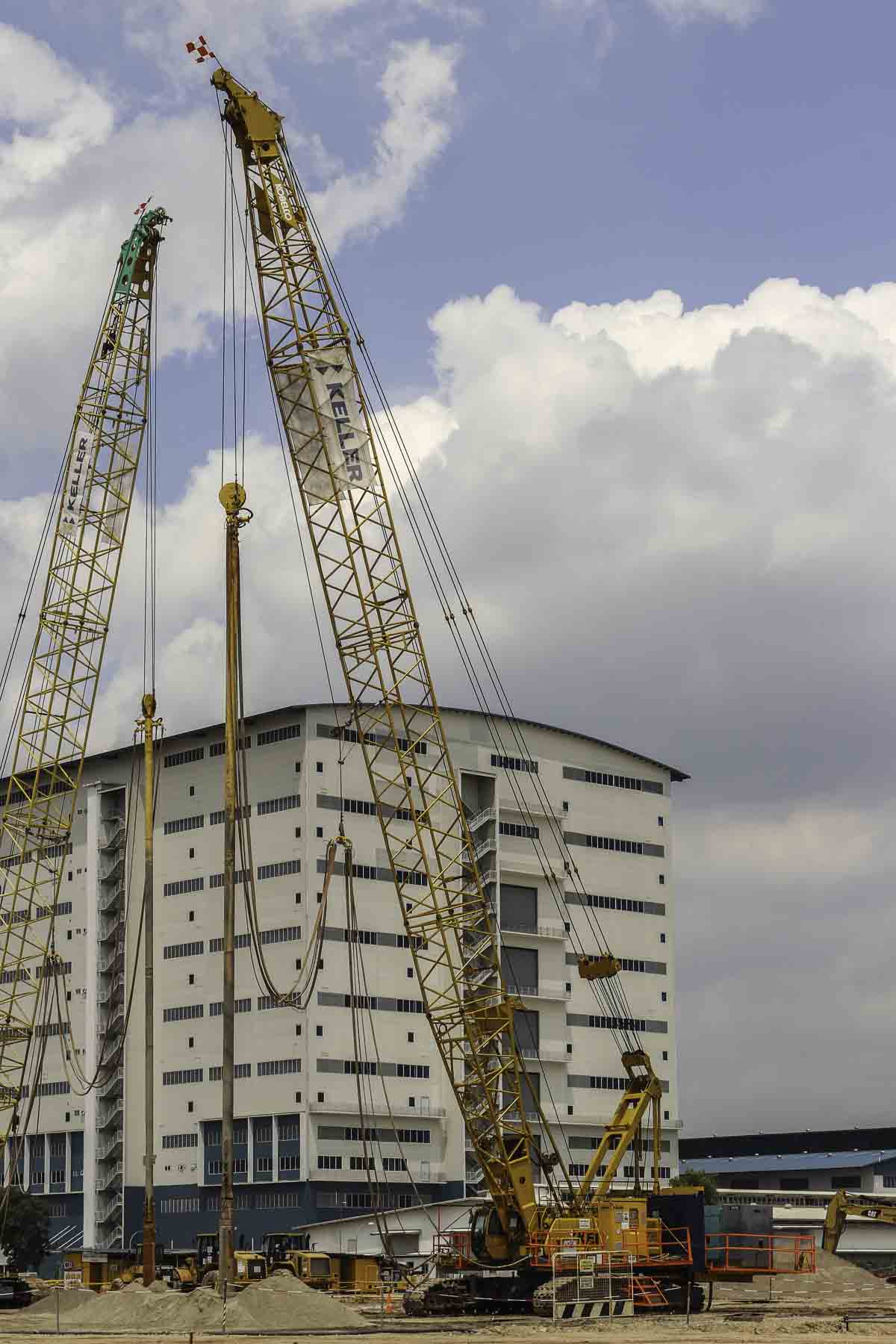 Deze fraaie Kobelco 7120S van Keller uit Singapore (SG) werd op een bouwplaats in Singapore voor de bodemverdichting voor een nieuwe rafinaderij ingezet. Het is een 120-tons rupskraan.