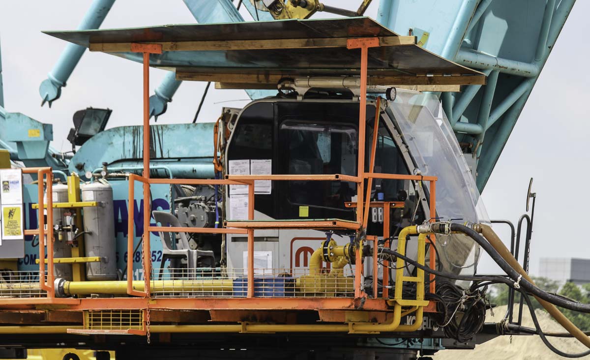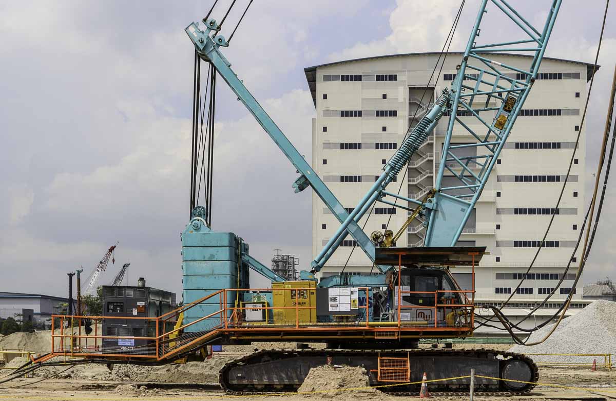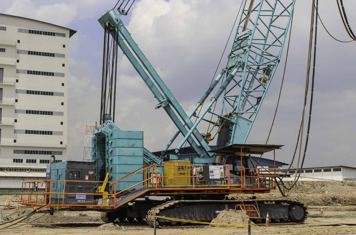 Deze imposante Kobelco CKE2500-2 van Multi Ways uit Singapore (SG) werd samen met een Kobelco 7120S voor bodemverdichting ingezet.