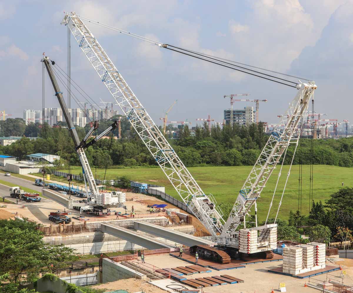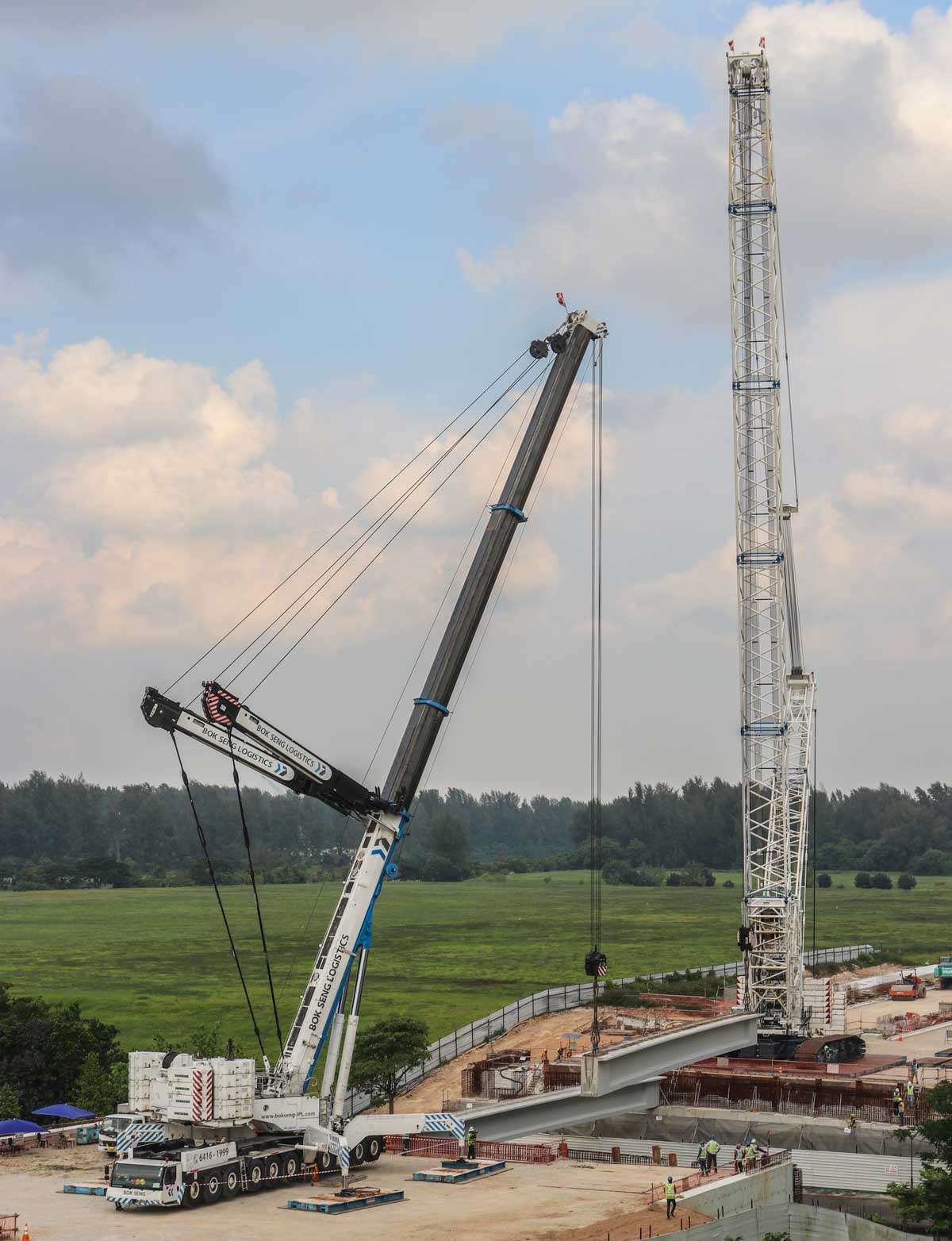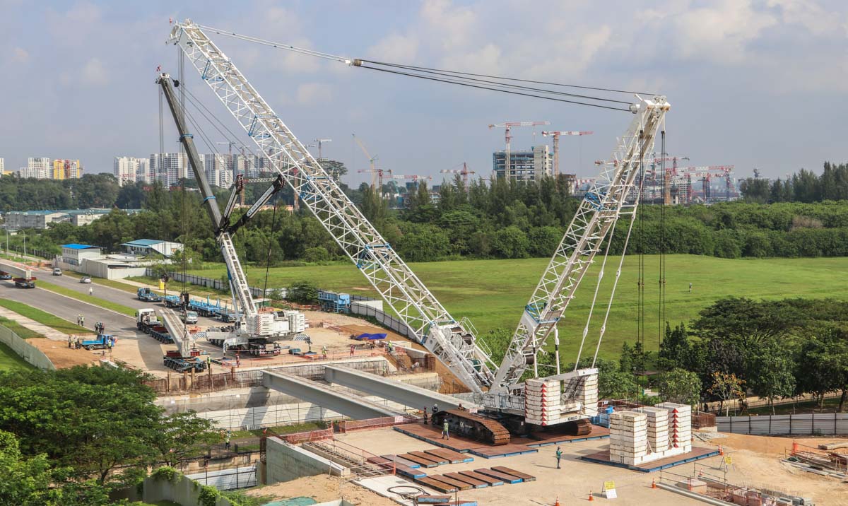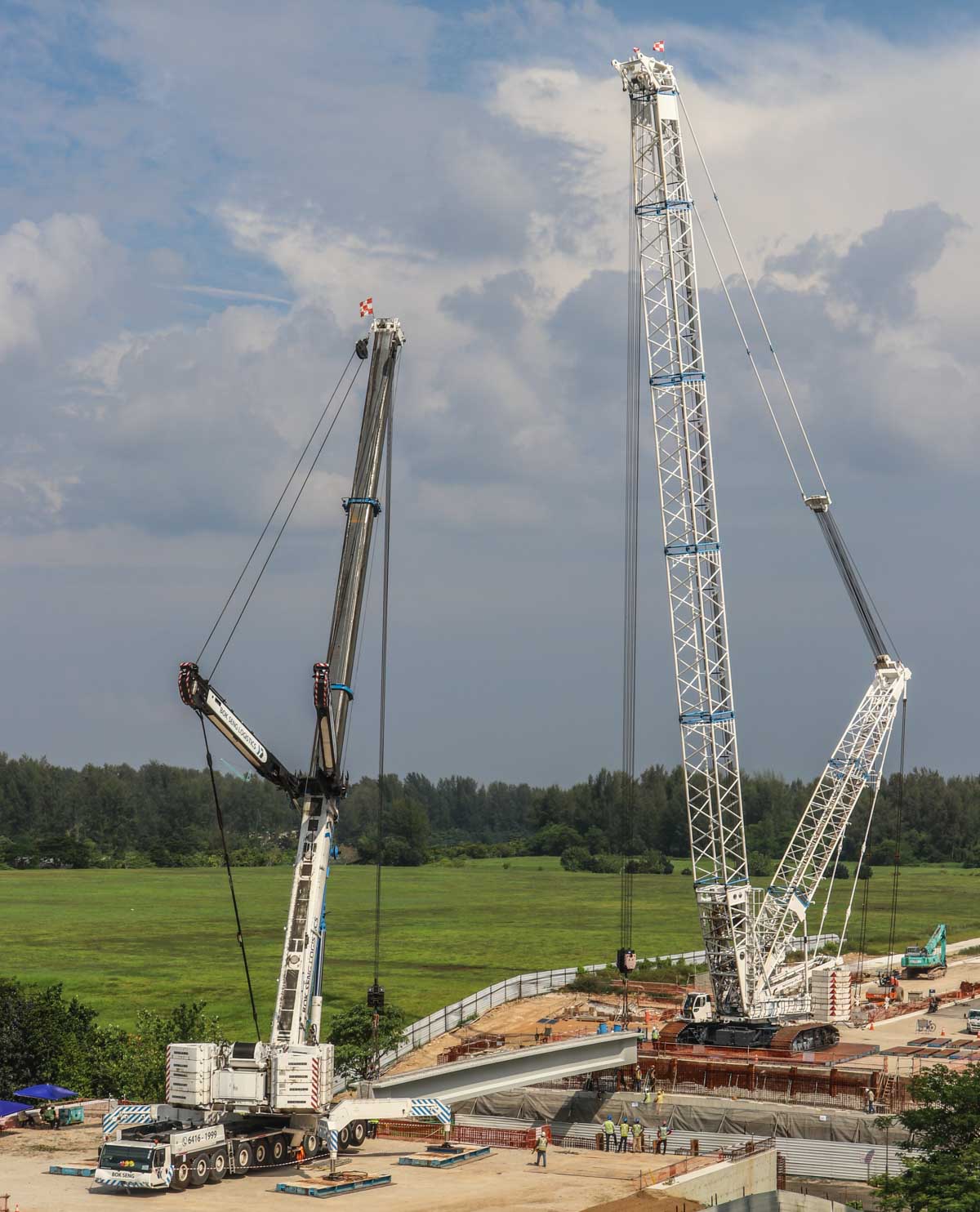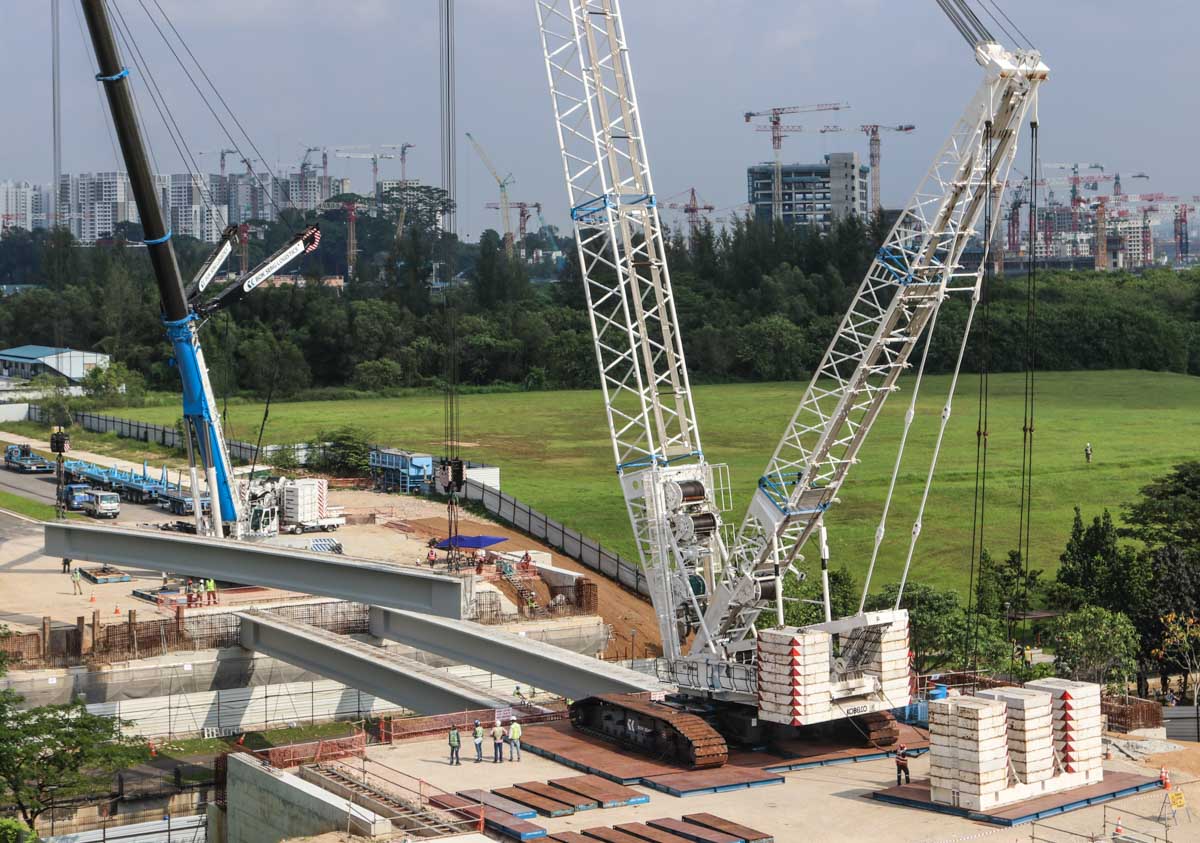 Bok Seng uit Singapore (SG) zette voor de montage van zware betonnen balken voor bruggen twee grote hijskranen in. Het zijn de Kobelco SL6000 en de Liebherr LTM 1750-9.1.