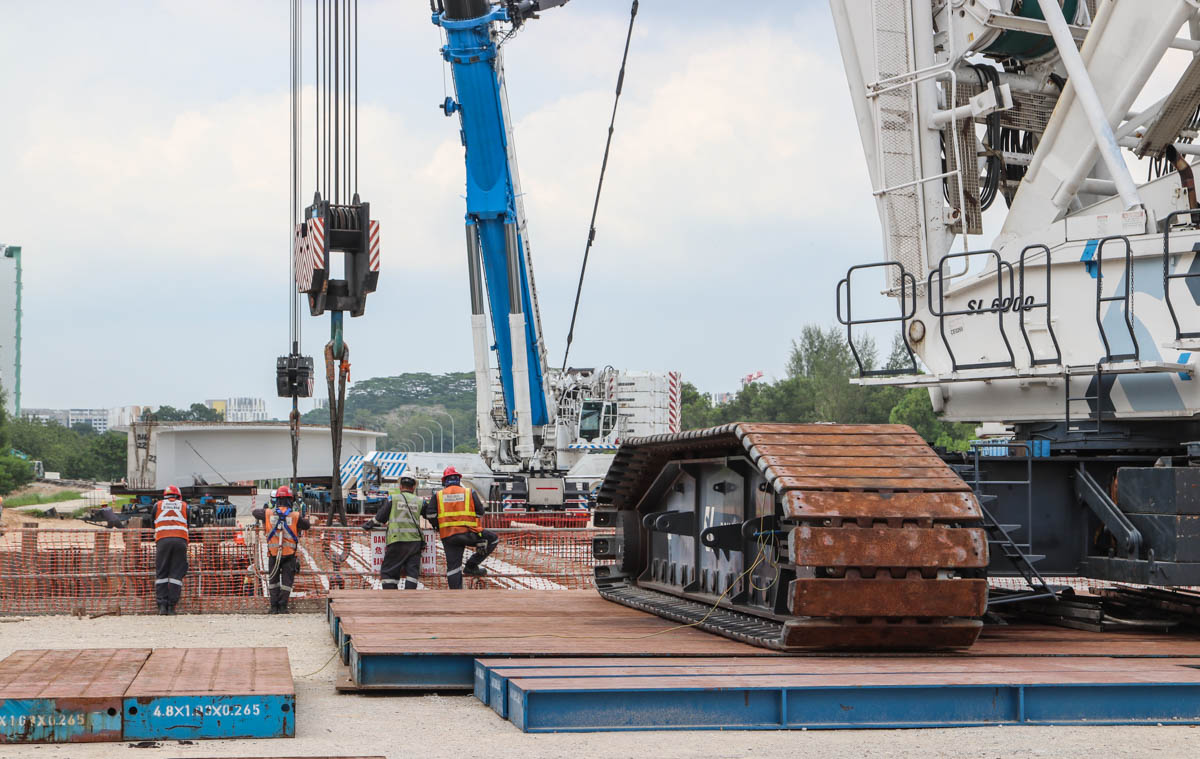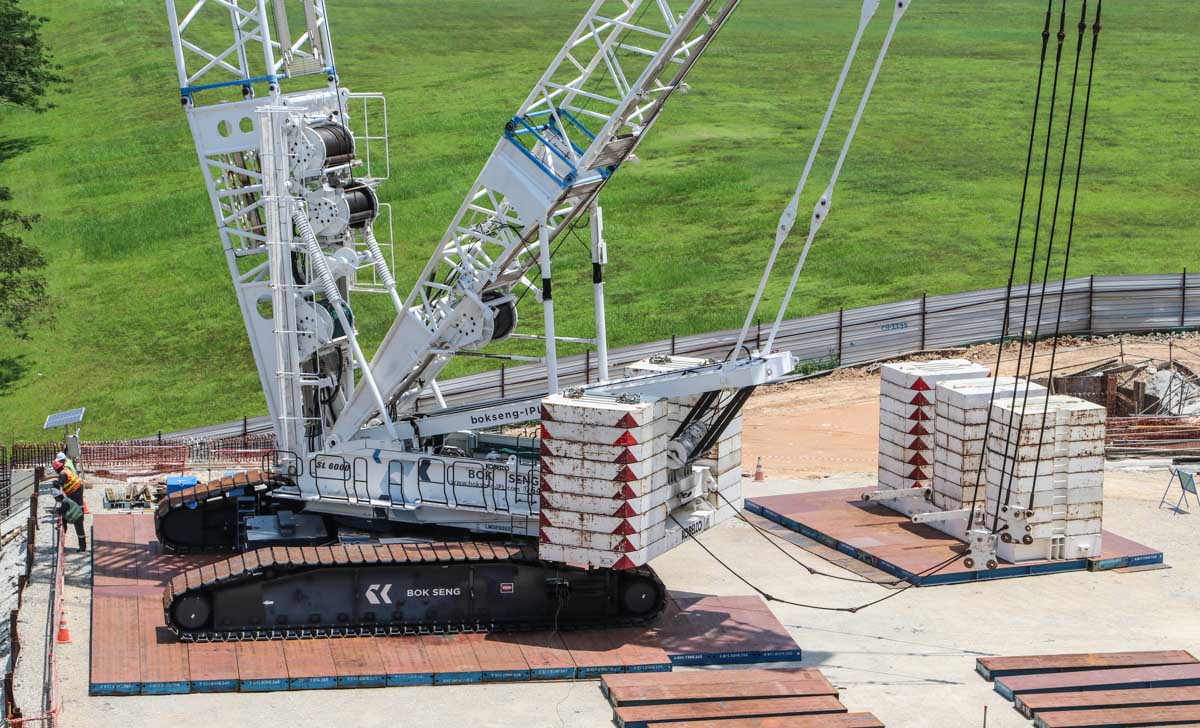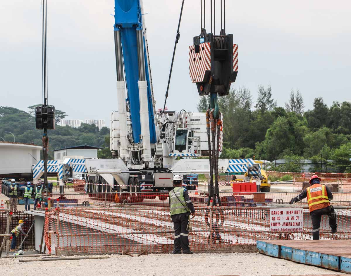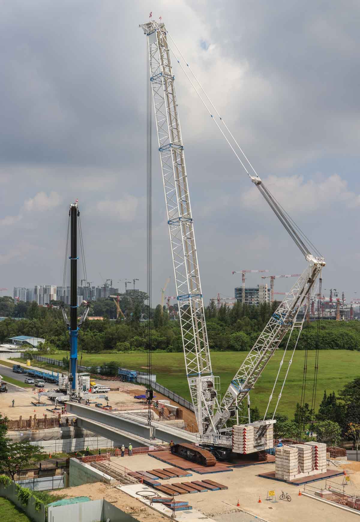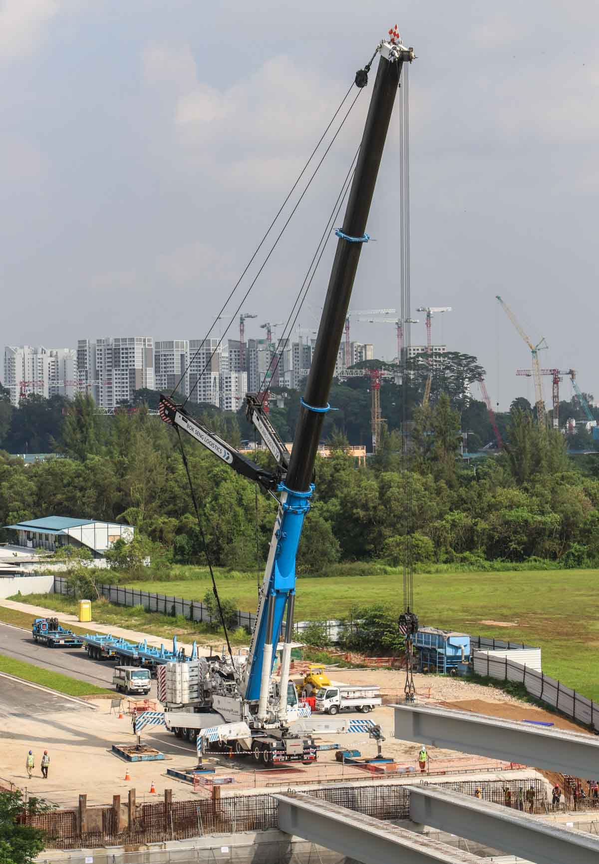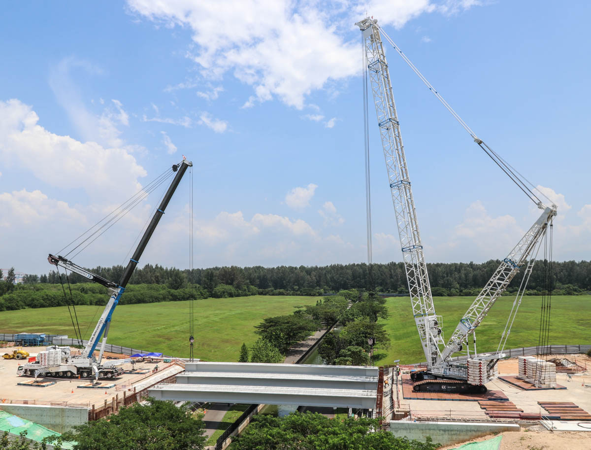 Bok Seng uit Singapore (SG) zette voor de montage van zware betonnen balken voor bruggen twee grote hijskranen in. Het zijn de Kobelco SL6000 en de Liebherr LTM 1750-9.1.