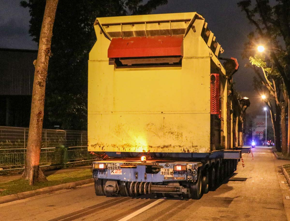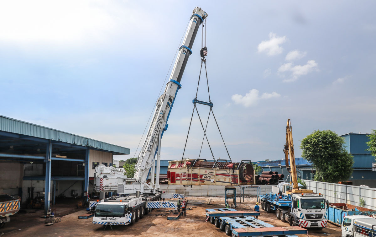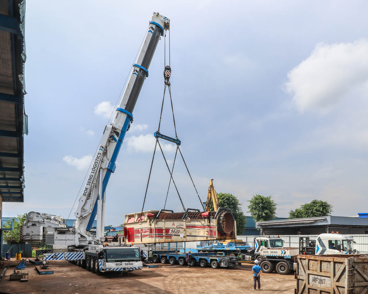 Voor de verhuizing van een zware statische MBS M820 trommel zette Bok Seng uit Singapore (SG) groot materieel in. Op de oude locatie stond deze Liebherr LTM 1500-8.1 opgesteld.