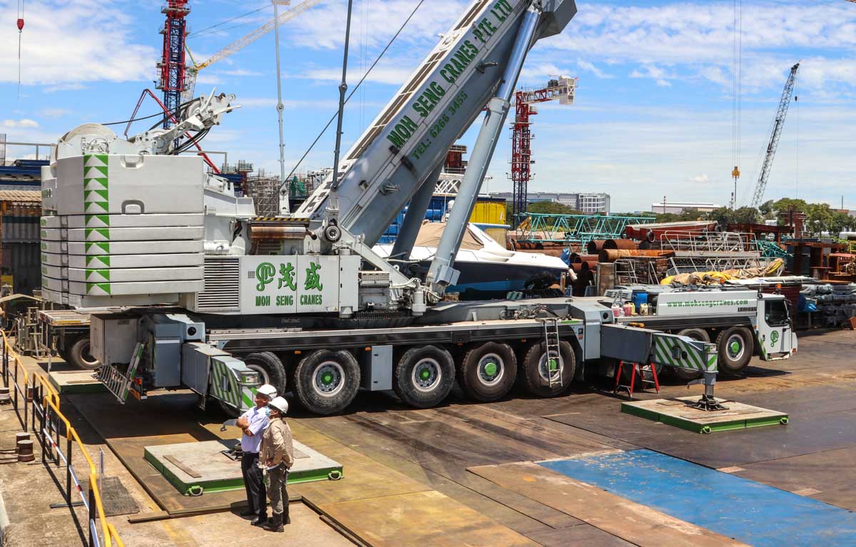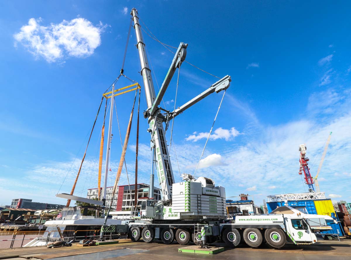 Hier zou de fraaie Liebherr LTM 1500-8.1 van Moh Seng uit Singapore (SG) voor het hijsen van een catamaran ingezet worden.