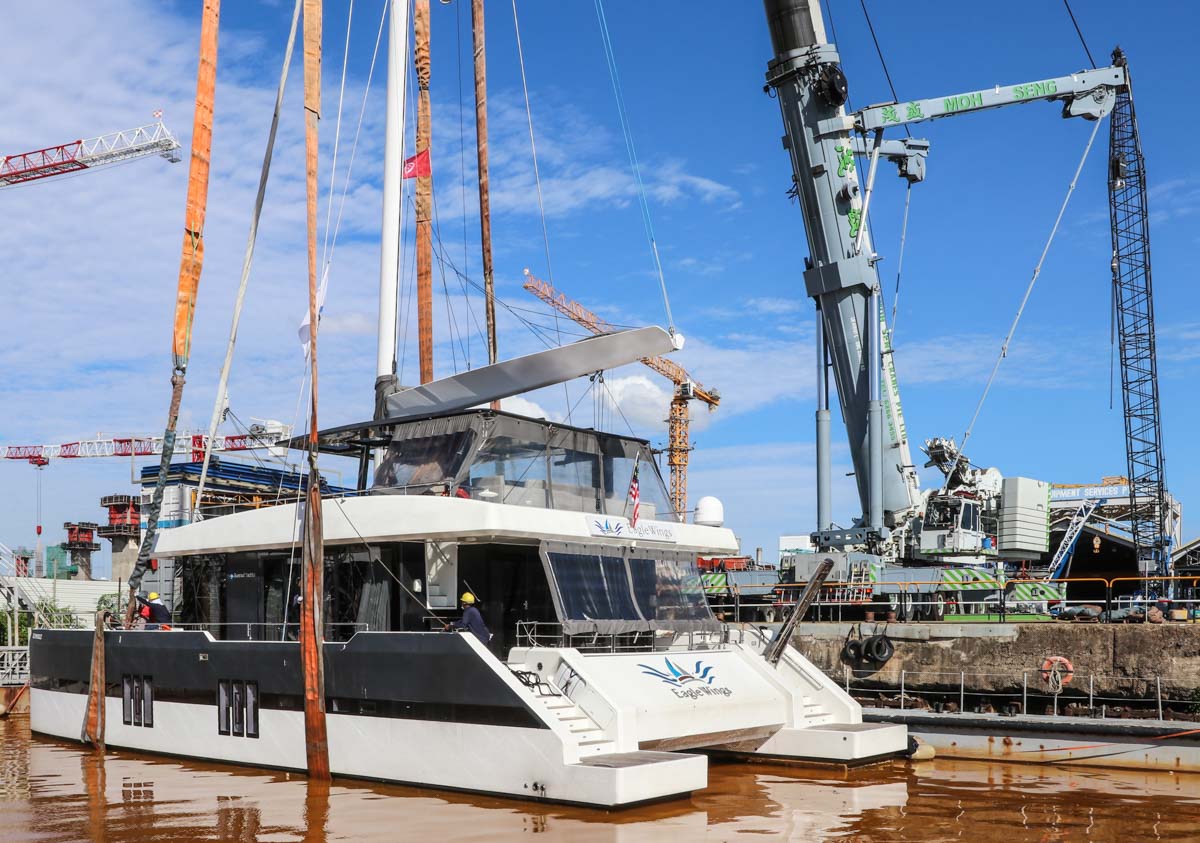 Hier komt de catamaran al aangevaren. De lange zeilmast zal een uitdaging zijn bij het hijsen.