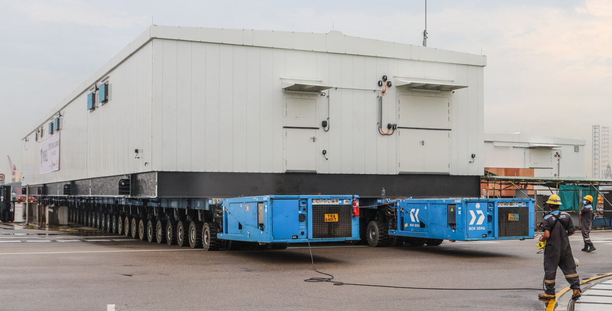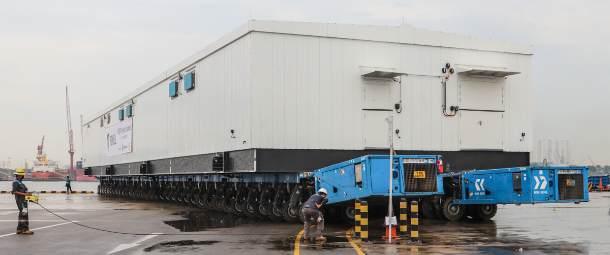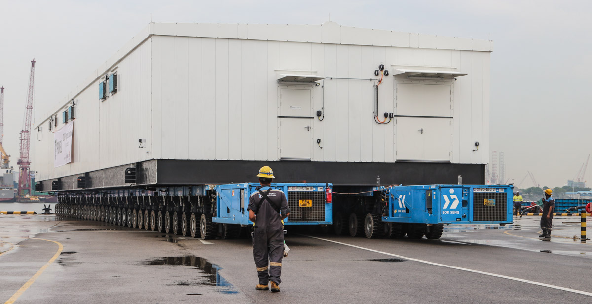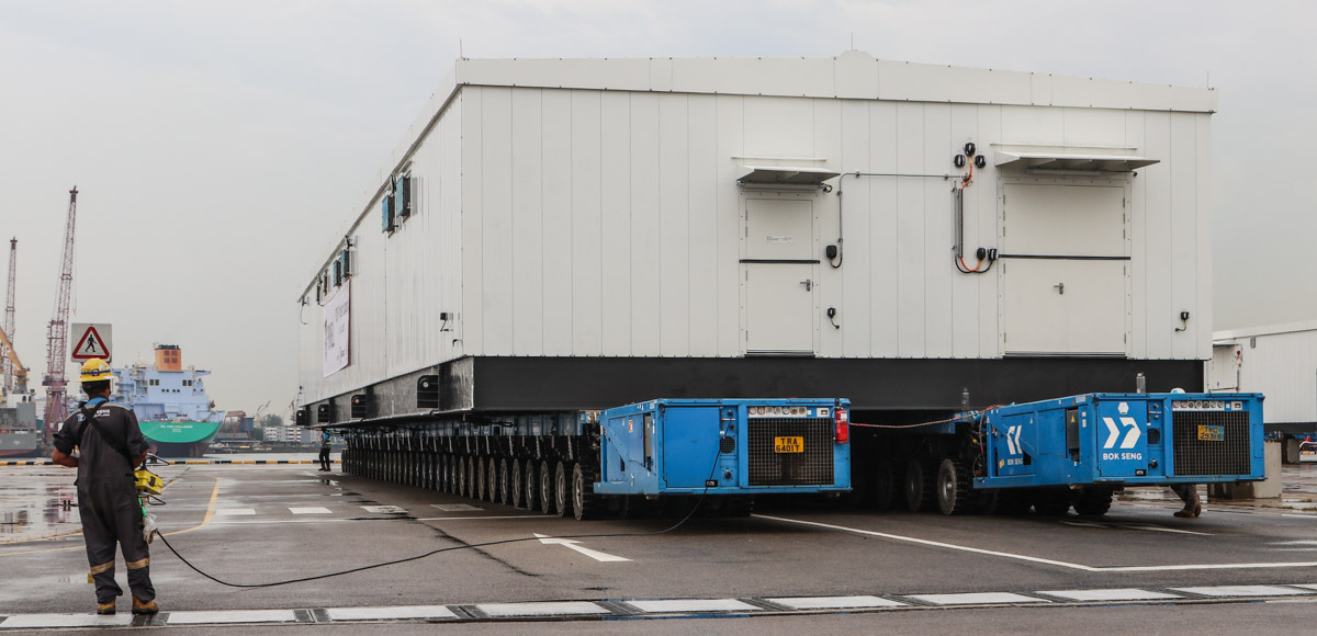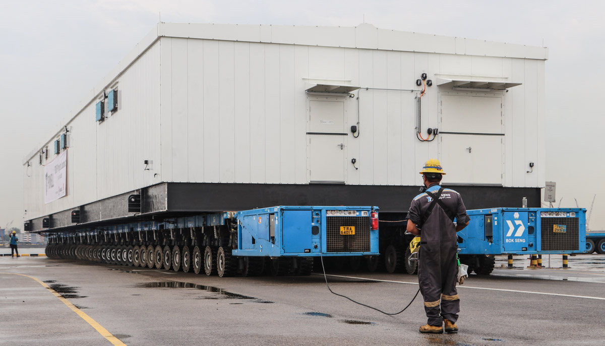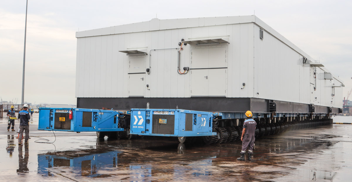 In oktober 2021 voerde Bok Seng uit Singapore (SG) een groot transport uit. Een groot E-House voor een rafinaderij was op een haventerrein gebouwd en moest op een ponton gereden worden.