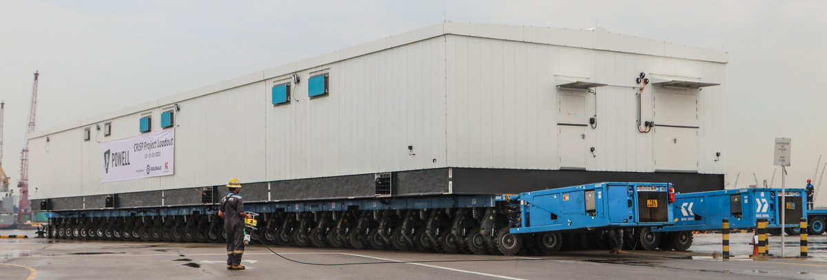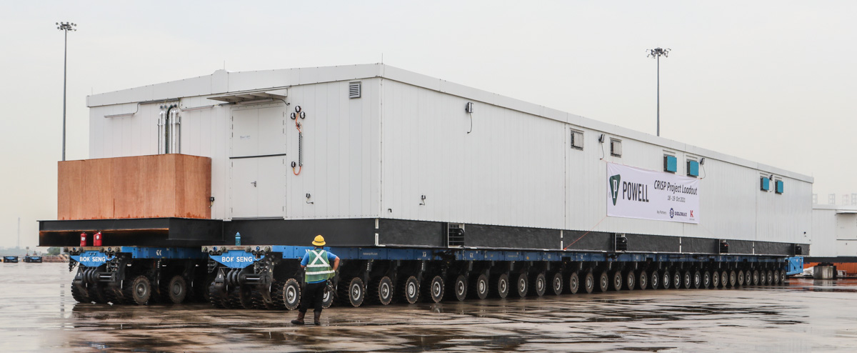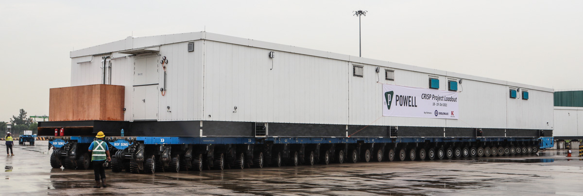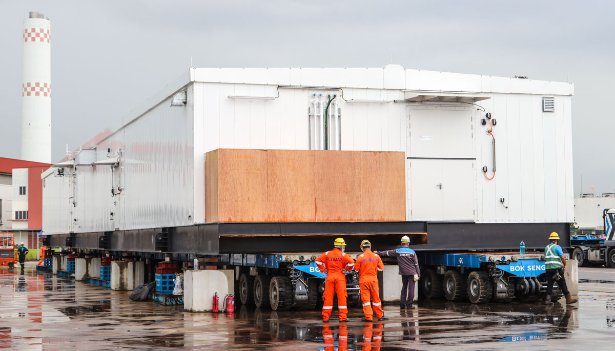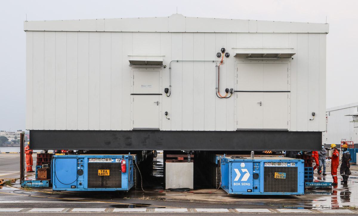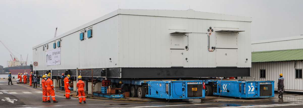 In oktober 2021 voerde Bok Seng uit Singapore (SG) een groot transport uit. Een groot E-House voor een rafinaderij was op een haventerrein gebouwd en moest op een ponton gereden worden.