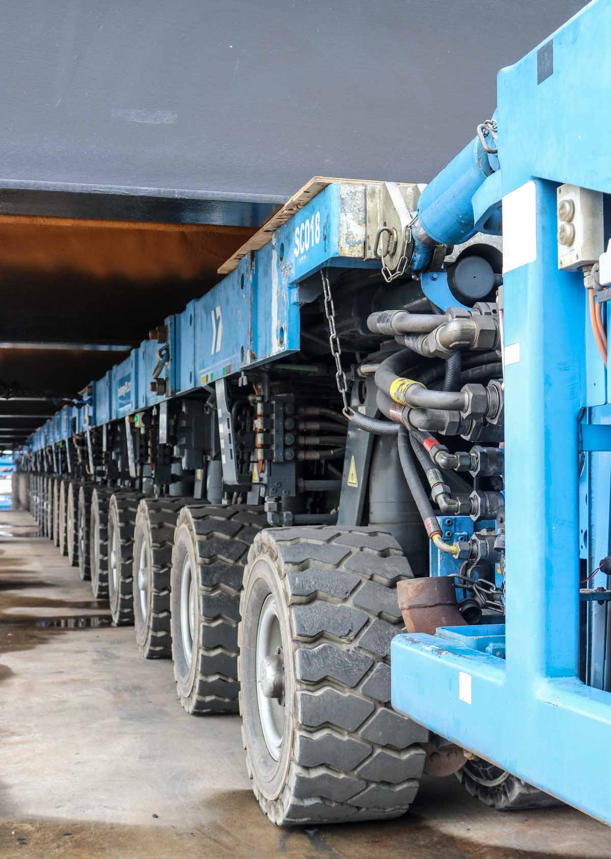 Bok Seng zette voor het transport twee 34-assige SPMT in. De assen zijn niet zozeer voor het gewicht, maar voor een constante ondersteuning van de last nodig omdat de lading niet mag buigen.