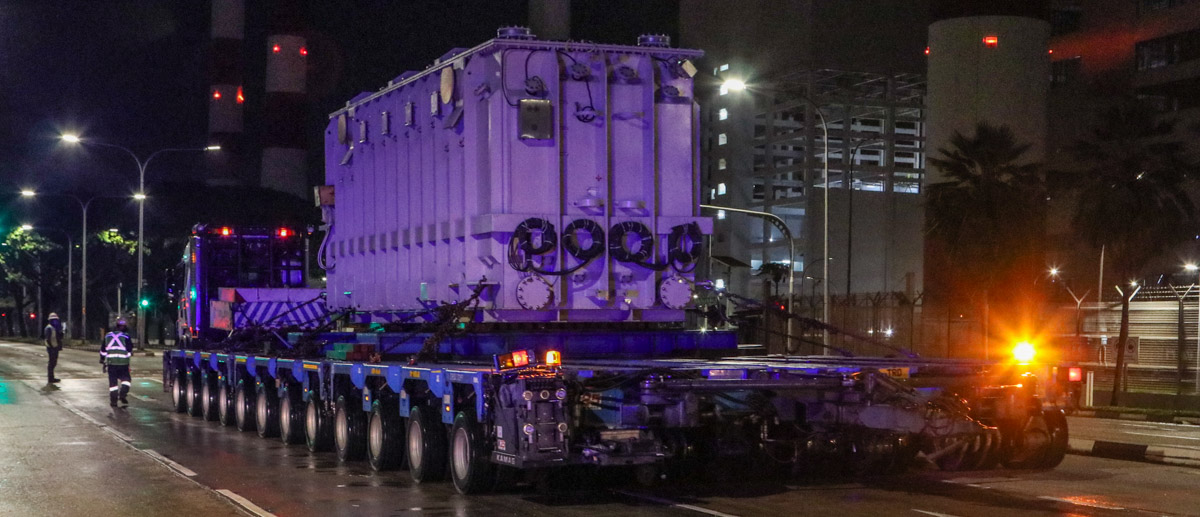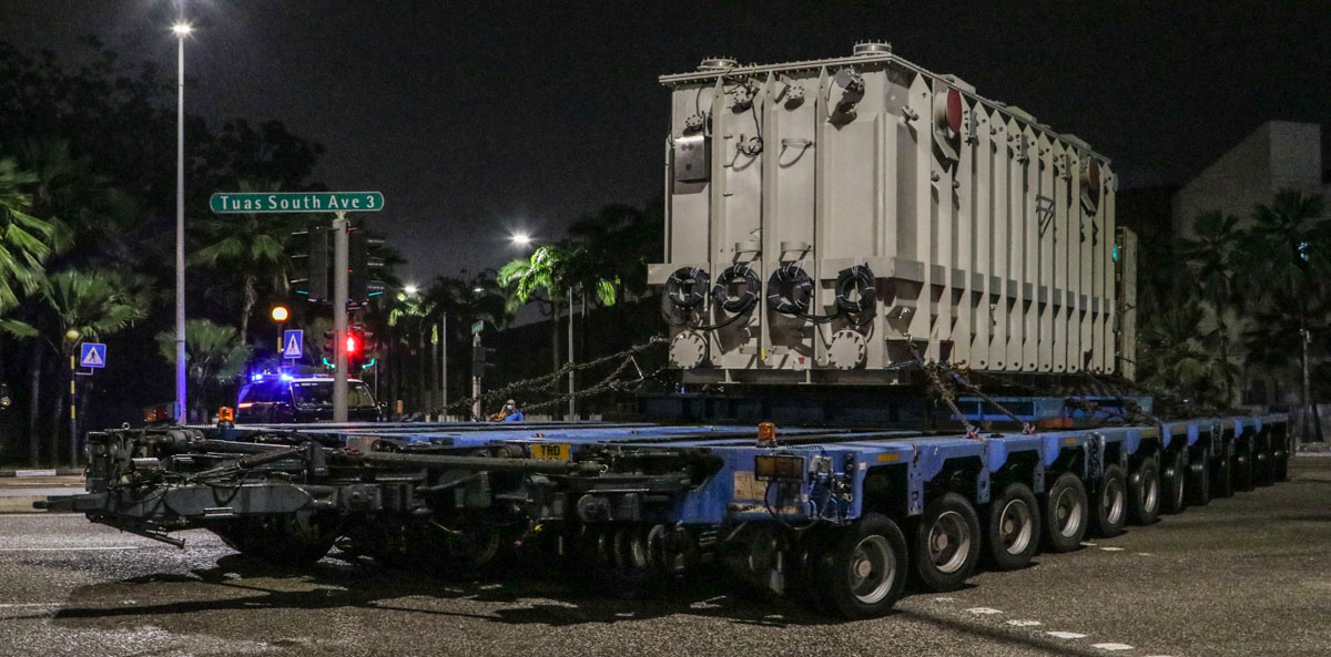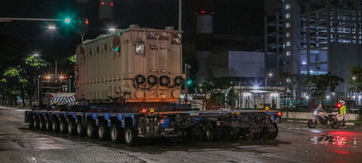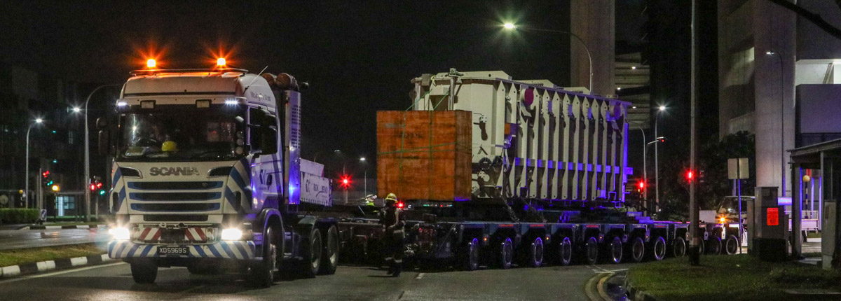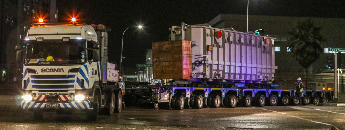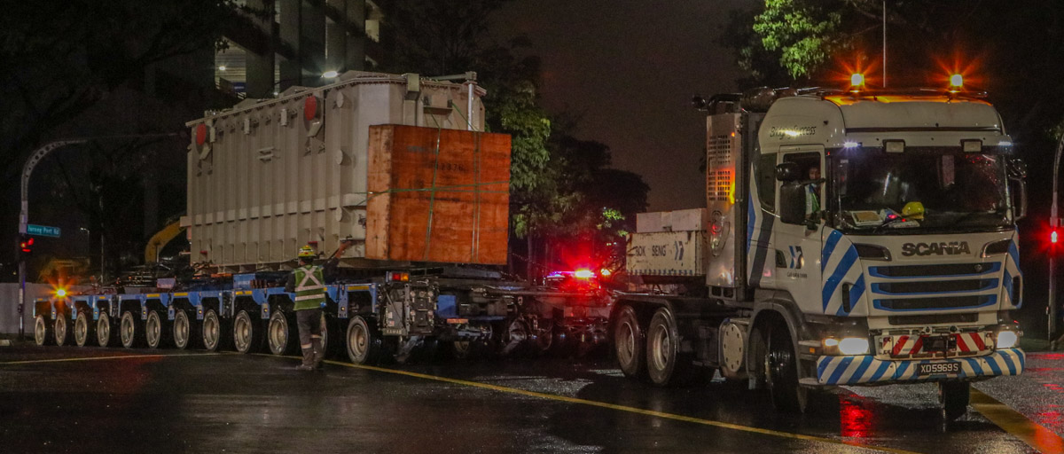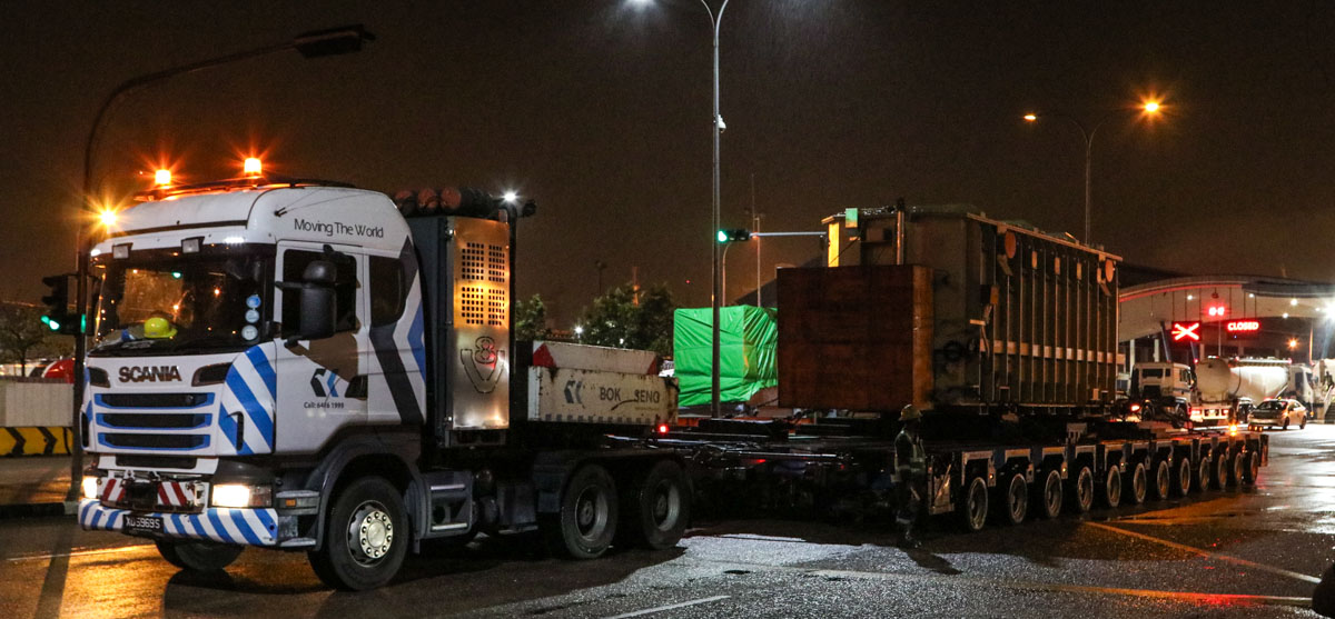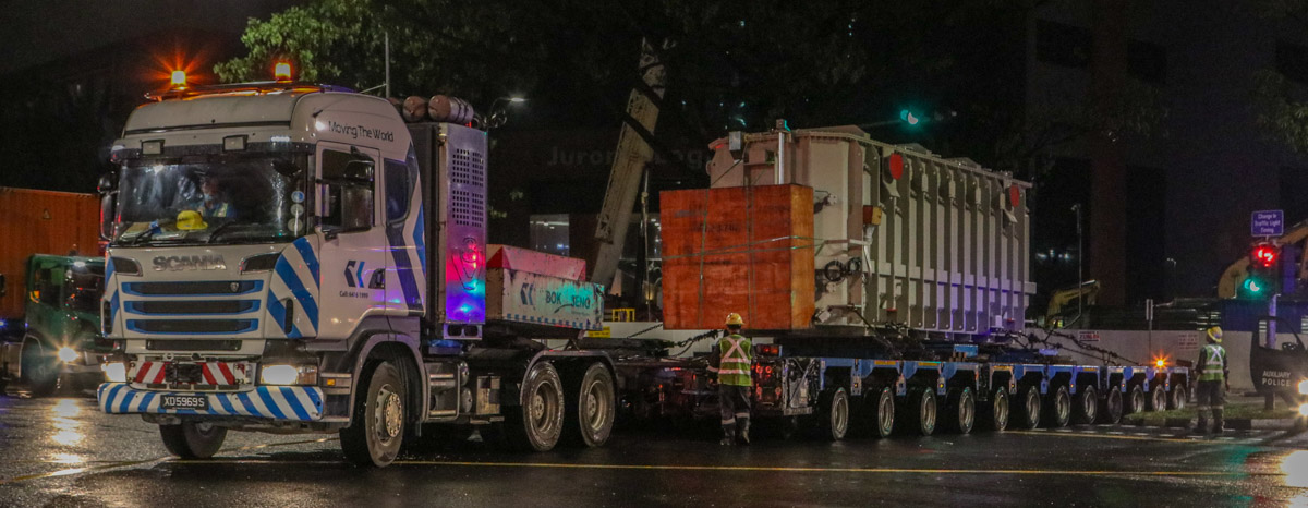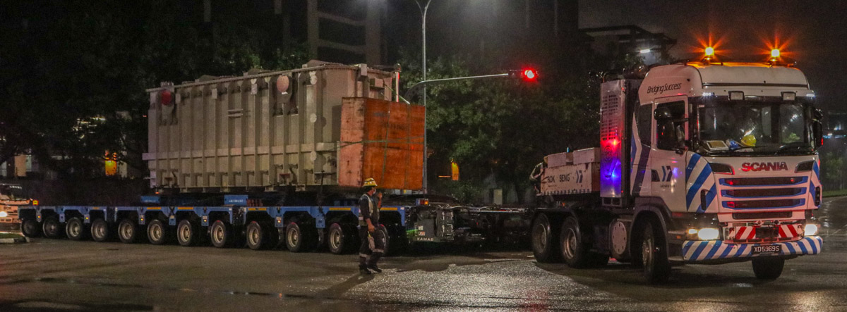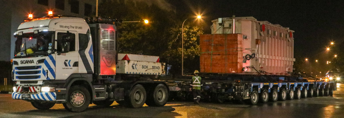 Eind 2021 voerde Bok Seng uit Singapore (SG) een zwaar en groot transport op de openbare weg uit. Een hele zware transformtor moest vanaf de haven naar een bouwplaats gereden worden.