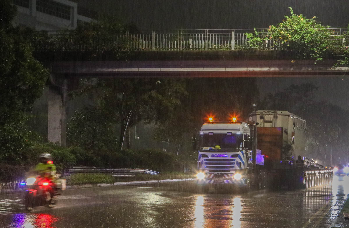 Niet alleen de breedte, gewicht en lengte bieden uitdagingen. Het regenachtige weer maakt het ook lastig, de Scania past de snelheid aan de weersomstandigheden aan.